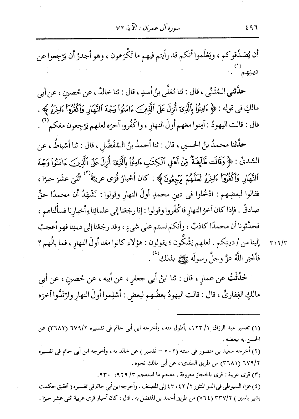 حَدَّثَنِي الْمُثَنَّى، قَالَ: ثنا مُعَلَّى بْنُ أَسَدٍ، قَالَ: ثنا خَالِدٌ، عَنْ حُصَيْنٍ، عَنْ أَبِي مَالِكٍ، فِي قَوْلِهِ: {§آمِنُوا بِالَّذِي أُنْزِلَ عَلَى الَّذِينَ آمَنُوا وَجْهَ النَّهَارِ وَاكْفُرُوا آخِرَهُ} [آل عمران: 72] قَالَ: " قَالَتِ الْيَهُودُ: آمِنُوا مَعَهُمْ أَوَّلَ النَّهَارِ وَاكْفُرُوا آخِرَهُ، لَعَلَّهُمْ يَرْجِعُونَ مَعَكُمْ "