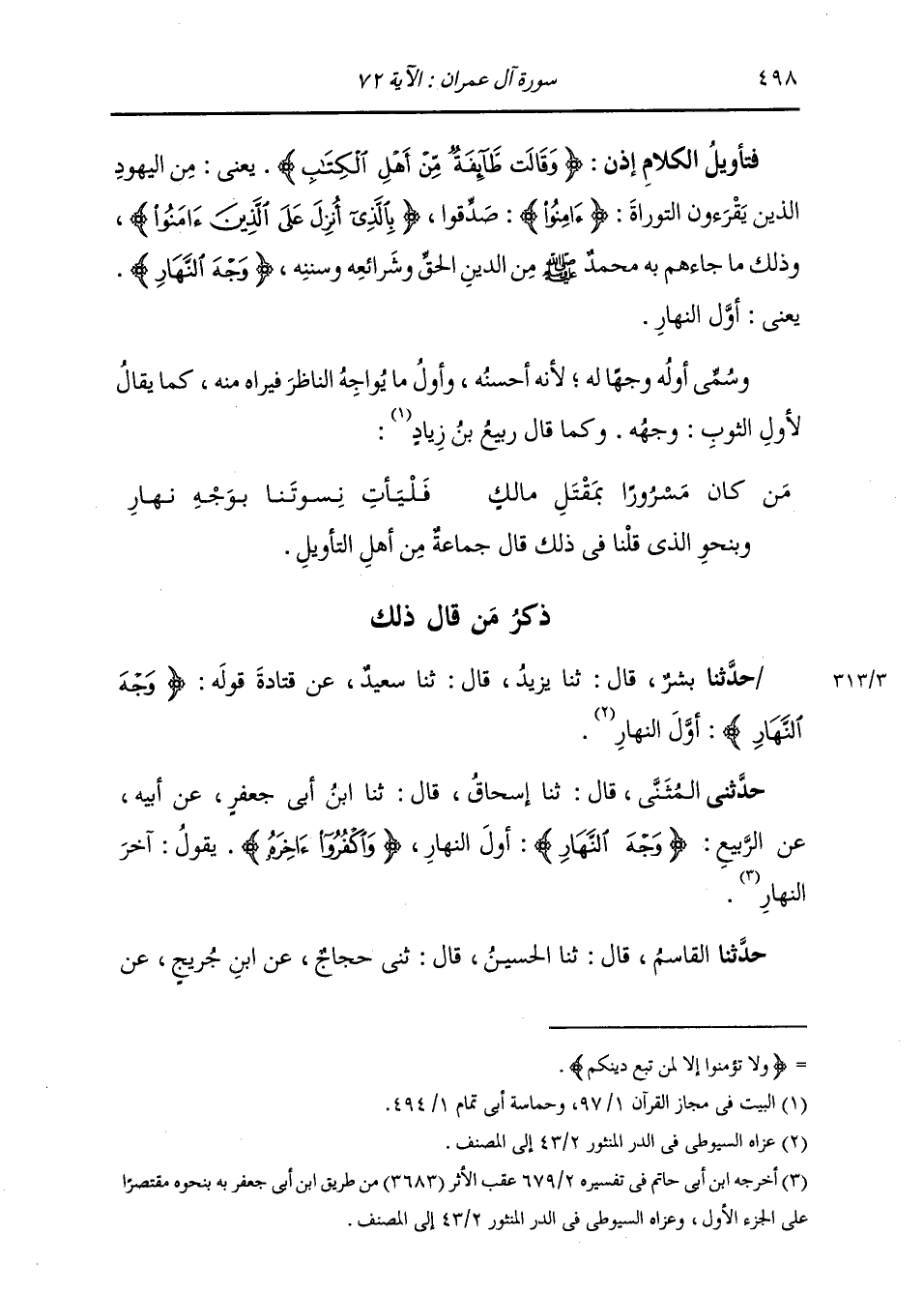 ذِكْرُ مَنْ قَالَ ذَلِكَ: حَدَّثَنَا بِشْرٌ، قَالَ: ثنا يَزِيدُ، قَالَ: ثنا سَعِيدٌ، عَنْ قَتَادَةَ، قَوْلُهُ: {§وَجْهَ النَّهَارِ} [آل عمران: 72] : «أَوَّلَ النَّهَارِ»