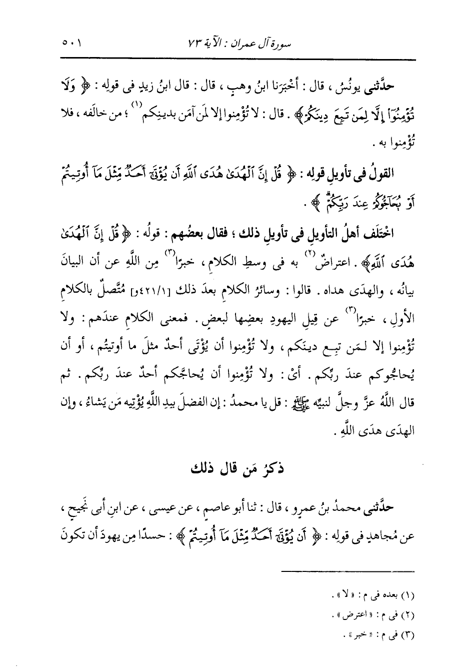 §الْقَوْلُ فِي تَأْوِيلِ قَوْلِهِ تَعَالَى: {قُلْ إِنَّ الْهُدَى هُدَى اللَّهِ أَنْ يُؤْتَى أَحَدٌ مِثْلَ مَا أُوتِيتُمْ أَوْ يُحَاجُّوكُمْ عِنْدَ رَبِّكُمْ} [آل عمران: 73] اخْتَلَفَ أَهْلُ التَّأْوِيلِ فِي تَأْوِيلِ ذَلِكَ، فَقَالَ بَعْضُهُمْ: قَوْلُهُ: {قُلْ إِنَّ الْهُدَى هُدَى اللَّهِ} [آل عمران: 73] اعْتُرِضَ بِهِ فِي وَسَطِ الْكَلَامِ خَبَرًا مِنَ اللَّهِ عَنْ أَنَّ الْبَيَانَ بَيَانُهُ وَالْهُدَى هَدَاهُ، قَالُوا: وَسَائِرُ الْكَلَامِ بَعْدَ ذَلِكَ مُتَّصِلٌ بِالْكَلَامِ الْأَوَّلِ خَبَرًا عَنْ قِيلِ الْيَهُودِ بَعْضِهَا لِبَعْضٍ، فَمَعْنَى الْكَلَامِ عِنْدَهُمْ: وَلَا تُؤْمِنُوا إِلَّا لِمَنْ تَبِعَ دِينَكُمْ، وَلَا تُؤْمِنُوا أَنْ يُؤْتَى أَحَدٌ مِثْلَ مَا أُوتِيتُمْ، أَوْ أَنْ يُحَاجُّوكُمْ عِنْدَ رَبِّكُمْ: أَيْ وَلَا تُؤْمِنُوا أَنْ يُحَاجَّكُمْ أَحَدٌ عِنْدَ رَبِّكُمْ. ثُمَّ قَالَ اللَّهُ عَزَّ وَجَلَّ لِنَبِيِّهِ صَلَّى اللهُ عَلَيْهِ وَسَلَّمَ: قُلْ يَا مُحَمَّدُ إِنَّ الْفَضْلَ بِيَدِ اللَّهِ يُؤْتِيهِ مَنْ يَشَاءُ، وَإِنَّ الْهُدَى هُدَى اللَّهِ