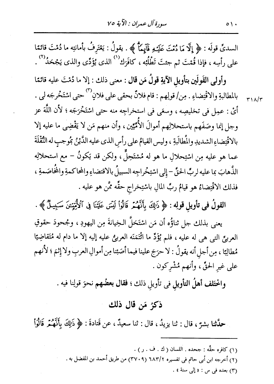 §الْقَوْلُ فِي تَأْوِيلِ قَوْلِهِ تَعَالَى: {ذَلِكَ بِأَنَّهُمْ قَالُوا لَيْسَ عَلَيْنَا فِي الْأُمِّيِّينَ سَبِيلٌ} [آل عمران: 75] يَعْنِي بِذَلِكَ جَلَّ ثناؤُهُ: أَنَّ مَنِ اسْتَحَلَّ الْخِيَانَةَ مِنَ الْيَهُودِ وَجُحُودَ حُقُوقِ الْعَرَبِيِّ الَّتِي هِيَ لَهُ عَلَيْهِ، فَلَمْ يُؤَدِّ مَا ائْتَمَنَهُ الْعَرَبِيُّ عَلَيْهِ إِلَيْهِ إِلَّا مَا دَامَ لَهُ مُتَقَاضِيًا مُطَالِبًا، مِنْ أَجْلِ أَنَّهُ يَقُولُ: لَا حَرَجَ عَلَيْنَا فِيمَا أَصَبْنَا مِنْ أَمْوَالِ الْعَرَبِ، وَلَا إِثْمَ؛ لِأَنَّهُمْ عَلَى غَيْرِ الْحَقِّ، وَأَنَّهُمْ مُشْرِكُونَ. وَاخْتَلَفَ أَهْلُ التَّأْوِيلِ فِي تَأْوِيلِ ذَلِكَ، فَقَالَ بَعْضُهُمْ نَحْوَ قَوْلِنَا فِيهِ