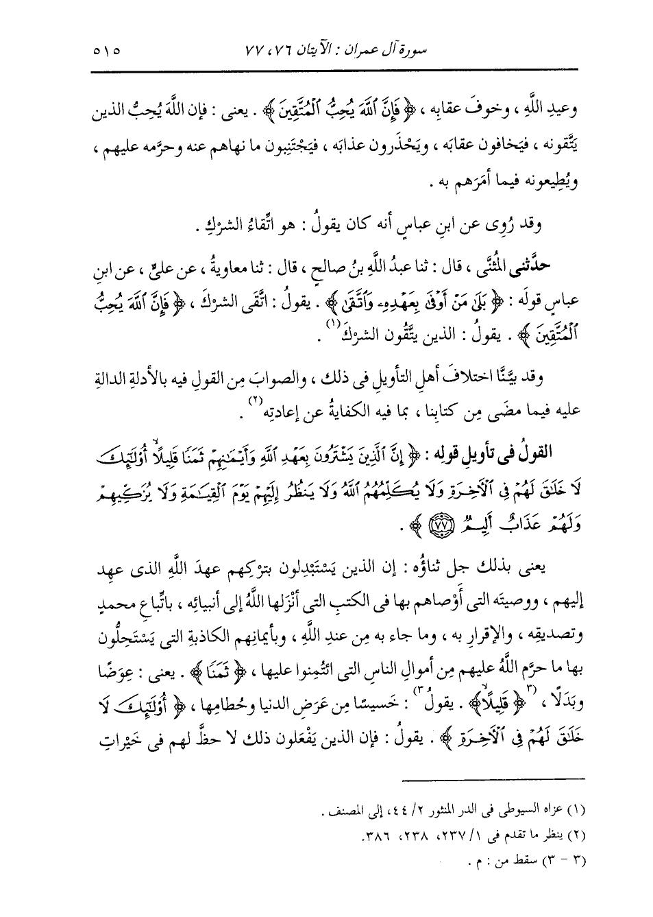 حَدَّثَنِي الْمُثَنَّى، قَالَ: ثنا عَبْدُ اللَّهِ بْنُ صَالِحٍ، قَالَ: ثنا مُعَاوِيَةُ، عَنْ عَلِيٍّ، عَنِ ابْنِ عَبَّاسٍ، قَوْلُهُ: {§بَلَى مَنْ أَوْفَى بِعَهْدِهِ وَاتَّقَى} [آل عمران: 76] يَقُولُ: «اتَّقَى الشِّرْكَ» ؛ {إِنَّ اللَّهَ يُحِبُّ الْمُتَّقِينَ} [التوبة: 4] يَقُولُ: «الَّذِينَ يَتَّقُونَ الشِّرْكَ» وَقَدْ بَيَّنَّا اخْتِلَافَ أَهْلِ التَّأْوِيلِ فِي ذَلِكَ، وَالصَّوَابُ مِنَ الْقَوْلِ فِيهِ بِالْأَدِلَّةِ الدَّالَّةِ عَلَيْهِ فِيمَا مَضَى مِنْ كِتَابِنَا بِمَا فِيهِ الْكِفَايَةُ عَنْ إِعَادَتِهِ