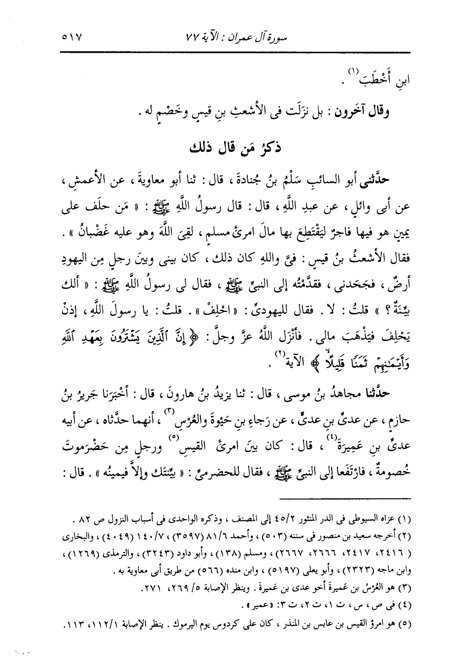 ذِكْرُ مَنْ قَالَ ذَلِكَ: حَدَّثَنِي أَبُو السَّائِبِ سَلْمُ بْنُ جُنَادَةَ، قَالَ: ثنا أَبُو مُعَاوِيَةَ، عَنِ الْأَعْمَشِ، عَنْ أَبِي وَائِلٍ، عَنْ عَبْدِ اللَّهِ، قَالَ: قَالَ رَسُولُ اللَّهِ صَلَّى اللهُ عَلَيْهِ وَسَلَّمَ: «§مَنْ حَلَفَ عَلَى يَمِينٍ هُوَ فِيهَا فَاجِرٌ لِيَقْتَطِعَ بِهَا مَالَ امْرِئٍ مُسْلِمٍ، لَقِيَ اللَّهَ وَهُوَ عَلَيْهِ غَضْبَانُ» فَقَالَ الْأَشْعَثُ بْنُ قَيْسٍ: فِيَّ وَاللَّهِ كَانَ ذَلِكَ، كَانَ بَيْنِي وَبَيْنَ رَجُلٍ مِنَ الْيَهُودِ أَرْضٌ، فَجَحَدَنِي، فَقَدَّمْتُهُ إِلَى النَّبِيِّ صَلَّى اللهُ عَلَيْهِ وَسَلَّمَ، فَقَالَ لِي رَسُولُ اللَّهِ صَلَّى اللهُ عَلَيْهِ وَسَلَّمَ: «أَلَكَ بَيِّنَةٌ» ؟ قُلْتُ: لَا، فَقَالَ لِلْيَهُودِيِّ: «احْلِفْ» قُلْتُ: يَا رَسُولَ اللَّهِ إِذَنْ يَحْلِفُ فَيَذْهَبُ مَالِي، فَأَنْزَلَ اللَّهُ عَزَّ وَجَلَّ: {إِنَّ الَّذِينَ يَشْتَرُونَ بِعَهْدِ اللَّهِ وَأَيْمَانِهِمْ ثَمَنًا قَلِيلًا} [آل عمران: 77] الْآيَةَ. "