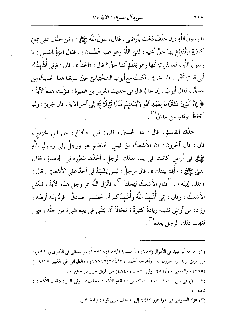 حَدَّثَنَا الْقَاسِمُ، قَالَ: ثنا الْحُسَيْنُ، قَالَ: ثني حَجَّاجٌ، عَنِ ابْنِ جُرَيْجٍ، قَالَ: قَالَ آخَرُونَ: إِنَّ الْأَشْعَثَ بْنَ قَيْسٍ اخْتَصَمَ هُوَ وَرَجُلٌ إِلَى رَسُولِ اللَّهِ صَلَّى اللهُ عَلَيْهِ وَسَلَّمَ فِي أَرْضٍ كَانَتْ فِي يَدِهِ لِذَلِكَ الرَّجُلِ أَخَذَهَا لِتَعَزُّزِهِ فِي الْجَاهِلِيَّةِ، فَقَالَ النَّبِيُّ صَلَّى اللهُ عَلَيْهِ وَسَلَّمَ: «§أَقِمْ بَيِّنَتَكَ» قَالَ الرَّجُلُ: لَيْسَ يَشْهَدُ لِي أَحَدٌ عَلَى الْأَشْعَثِ، قَالَ: «فَلَكَ يَمِينُهُ» . فَقَامَ الْأَشْعَثُ لِيَحْلِفَ، فَأَنْزَلَ اللَّهُ عَزَّ وَجَلَّ هَذِهِ الْآيَةَ، فَنَكَلَ الْأَشْعَثُ وَقَالَ: إِنِّي أُشْهِدُ اللَّهَ وَأُشْهِدُكُمْ أَنَّ خَصْمِيَ صَادِقٌ، فَرَدَّ إِلَيْهِ أَرْضَهُ، وَزَادَهُ مِنْ أَرْضِ نَفْسِهِ زِيَادَةً كَثِيرَةً، مَخَافَةَ أَنْ يَبْقَى فِي يَدِهِ شَيْءٌ مِنْ حَقِّهِ، فَهِيَ لِعَقِبِ ذَلِكَ الرَّجُلِ بَعْدَهُ "