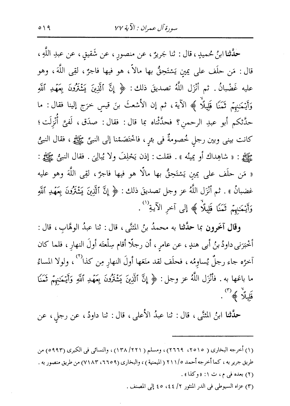 حَدَّثَنَا ابْنُ حُمَيْدٍ، قَالَ: ثنا جَرِيرٌ، عَنْ مَنْصُورٍ، عَنْ شَقِيقٍ، عَنْ عَبْدِ اللَّهِ، قَالَ: «§مَنْ حَلَفَ عَلَى يَمِينٍ يَسْتَحِقُّ بِهَا مَالًا هُوَ فِيهَا فَاجِرٌ لَقِيَ اللَّهَ وَهُوَ عَلَيْهِ غَضْبَانُ، ثُمَّ أَنْزَلَ اللَّهُ تَصْدِيقَ ذَلِكَ» : {إِنَّ الَّذِينَ يَشْتَرُونَ بِعَهْدِ اللَّهِ وَأَيْمَانِهِمْ ثَمَنًا قَلِيلًا} [آل عمران: 77] الْآيَةَ، ثُمَّ إِنَّ الْأَشْعَثَ بْنَ قَيْسٍ خَرَجَ إِلَيْنَا، فَقَالَ: مَا حَدَّثَكُمْ أَبُو عَبْدِ الرَّحْمَنِ؟ فَحَدَّثناهُ بِمَا قَالَ، فَقَالَ: صَدَقَ لَفِيَّ أُنْزِلَتْ، كَانَتْ بَيْنِي وَبَيْنَ رَجُلٍ خُصُومَةٌ فِي بِئْرٍ، فَاخْتَصَمْنَا إِلَى النَّبِيِّ صَلَّى اللهُ عَلَيْهِ وَسَلَّمَ، فَقَالَ النَّبِيُّ صَلَّى اللهُ عَلَيْهِ وَسَلَّمَ: «شَاهِدَاكَ أَوْ يَمِينُهُ» فَقُلْتُ: إِذًا يَحْلِفُ وَلَا يُبَالِي، فَقَالَ النَّبِيُّ صَلَّى اللهُ عَلَيْهِ وَسَلَّمَ: «مَنْ حَلَفَ عَلَى يَمِينٍ يَسْتَحِقُّ بِهَا مَالًا هُوَ فِيهَا فَاجِرٌ لَقِيَ اللَّهَ وَهُوَ عَلَيْهِ غَضْبَانُ» ، ثُمَّ أَنْزَلَ اللَّهُ عَزَّ وَجَلَّ تَصْدِيقَ ذَلِكَ: {إِنَّ الَّذِينَ يَشْتَرُونَ بِعَهْدِ اللَّهِ وَأَيْمَانِهِمْ ثَمَنًا قَلِيلًا} [آل عمران: 77] الْآيَةَ "