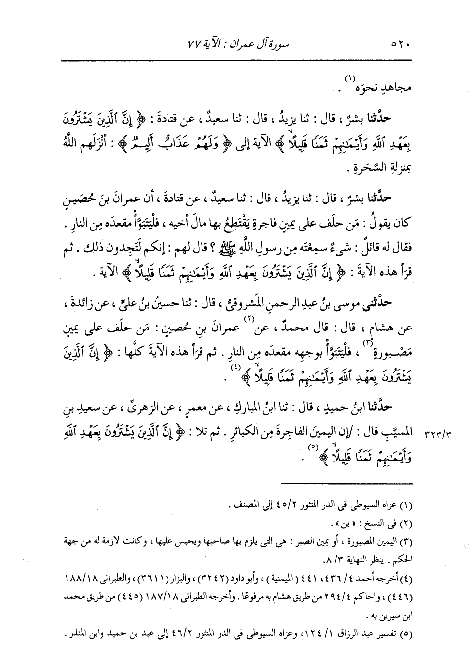 حَدَّثَنِي مُوسَى بْنُ عَبْدِ الرَّحْمَنِ الْمَسْرُوقِيُّ، قَالَ: ثنا حُسَيْنُ بْنُ عَلِيٍّ، عَنْ زَائِدَةَ، عَنْ هِشَامٍ، قَالَ: قَالَ مُحَمَّدٌ، عَنْ عِمْرَانَ بْنِ حُصَيْنٍ: «§مَنْ حَلَفَ عَلَى يَمِينٍ مَصْبُورَةٍ فَلْيَتَبَوَّأْ بِوَجْهِهِ مَقْعَدَهُ مِنَ النَّارِ» ، ثُمَّ قَرَأَ هَذِهِ الْآيَةَ كُلَّهَا: {إِنَّ الَّذِينَ يَشْتَرُونَ بِعَهْدِ اللَّهِ وَأَيْمَانِهِمْ ثَمَنًا قَلِيلًا} [آل عمران: 77]