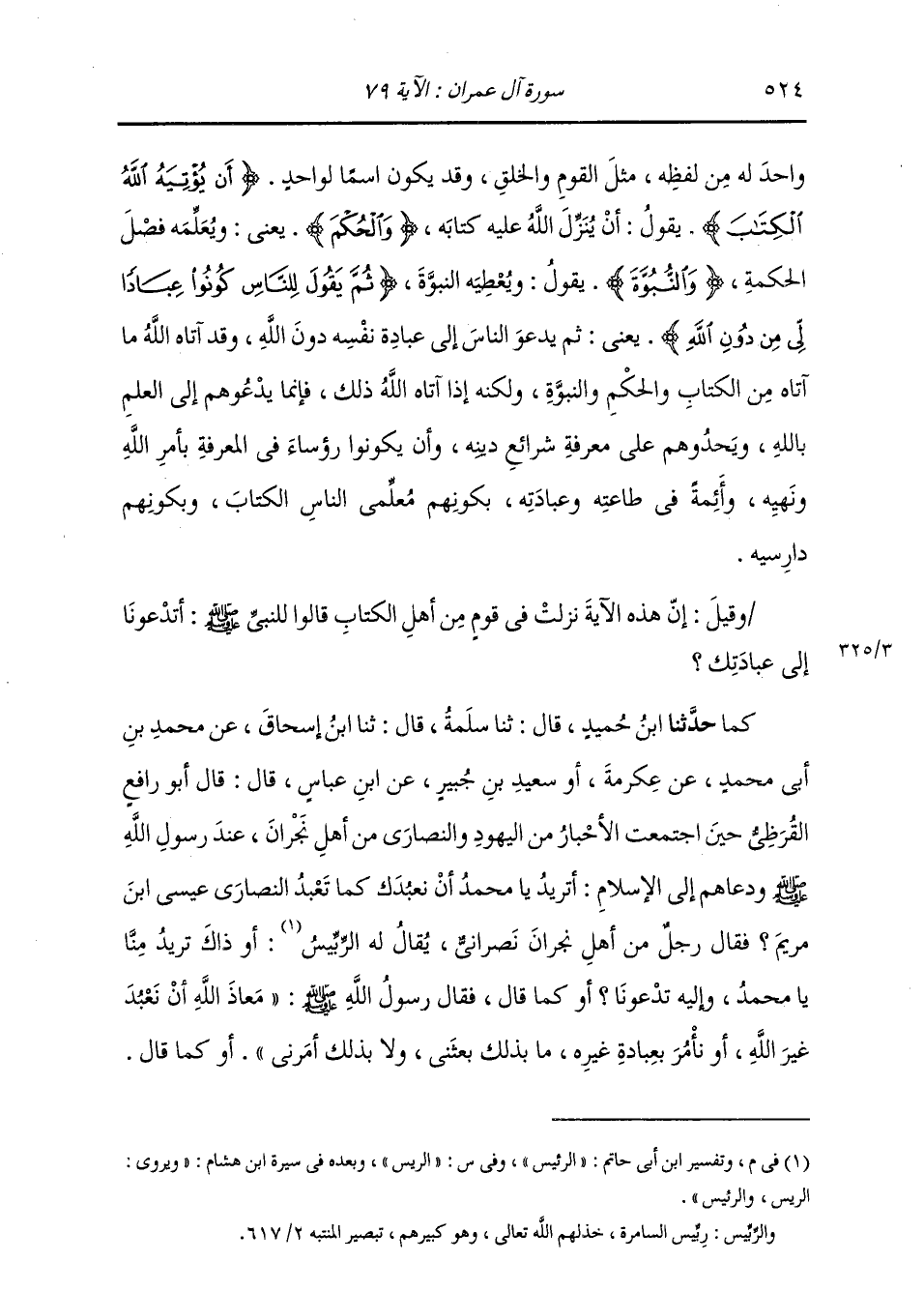 كَمَا: حَدَّثَنَا ابْنُ حُمَيْدٍ، قَالَ: ثنا سَلَمَةُ، قَالَ: ثنا ابْنُ إِسْحَاقَ، عَنْ مُحَمَّدِ بْنِ أَبِي مُحَمَّدٍ، عَنْ عِكْرِمَةَ أَوْ سَعِيدِ بْنِ جُبَيْرٍ، عَنِ ابْنِ عَبَّاسٍ، قَالَ: قَالَ أَبُو رَافِعٍ الْقُرَظِيُّ حِينَ اجْتَمَعَتِ الْأَحْبَارُ مِنَ الْيَهُودِ وَالنَّصَارَى مِنْ أَهْلِ نَجْرَانَ عِنْدَ رَسُولِ اللَّهِ صَلَّى اللهُ عَلَيْهِ وَسَلَّمَ وَدَعَاهُمْ إِلَى الْإِسْلَامِ: §أَتُرِيدُ يَا مُحَمَّدُ أَنْ نعَبُدَكَ كَمَا تَعْبُدُ النَّصَارَى عِيسَى ابْنَ مَرْيَمَ؟ فَقَالَ رَجُلٌ مِنْ أَهْلِ نَجْرَانَ نَصْرَانِيُّ، يُقَالُ لَهُ الرَّئِيسُ أَوَذَاكَ تُرِيدُ مِنَّا يَا مُحَمَّدُ وَإِلَيْهِ تَدْعُونَا؟ أَوْ كَمَا قَالَ، فَقَالَ رَسُولُ اللَّهِ صَلَّى اللهُ عَلَيْهِ وَسَلَّمَ: «مَعَاذَ اللَّهِ أَنْ نَعْبُدَ غَيْرَ اللَّهِ، أَوْ نَأْمُرَ بِعِبَادَةِ غَيْرِهِ، مَا بِذَلِكَ بَعَثني، وَلَا بِذَلِكَ أَمَرَنِي» ، أَوْ كَمَا قَالَ، -[525]- فَأَنْزَلَ اللَّهُ عَزَّ وَجَلَّ فِي ذَلِكَ مِنْ قَوْلِهِمْ: {مَا كَانَ لِبَشَرٍ أَنْ يُؤْتِيَهُ اللَّهُ الْكِتَابَ وَالْحُكْمَ وَالنُّبُوَّةَ} [آل عمران: 79] الْآيَةَ، إِلَى قَوْلِهِ بَعْدُ: {إِذْ أَنْتُمْ مُسْلِمُونَ} [آل عمران: 80] حَدَّثَنَا أَبُو كُرَيْبٍ، قَالَ: ثنا يُونُسُ بْنُ بُكَيْرٍ، قَالَ: ثنا مُحَمَّدُ بْنُ إِسْحَاقَ، قَالَ: ثني مُحَمَّدُ بْنُ أَبِي مُحَمَّدٍ مَوْلَى زَيْدِ بْنِ ثَابِتٍ، قَالَ: ثني سَعِيدُ بْنُ جُبَيْرٍ أَوْ عِكْرِمَةُ، عَنِ ابْنِ عَبَّاسٍ، قَالَ: قَالَ أَبُو رَافِعٍ الْقُرَظِيُّ، فَذَكَرَ نَحْوَهُ