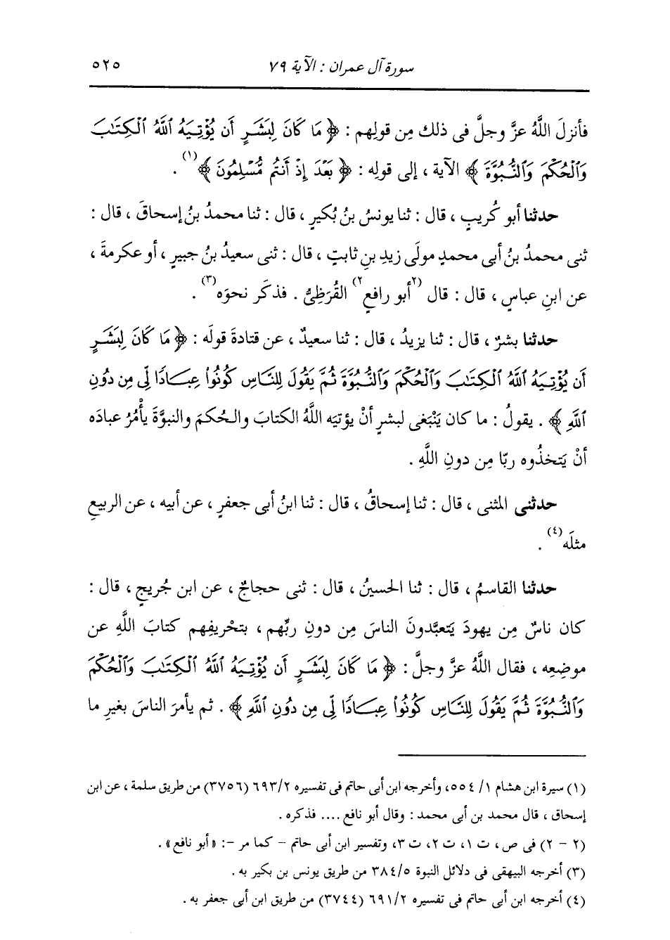 حَدَّثَنَا بِشْرٌ، قَالَ: ثنا يَزِيدُ، قَالَ: ثنا سَعِيدٌ، عَنْ قَتَادَةَ، قَوْلُهُ: {مَا كَانَ لِبَشَرٍ أَنْ يُؤْتِيَهُ اللَّهُ الْكِتَابَ وَالْحُكْمَ وَالنُّبُوَّةَ ثُمَّ §يَقُولَ لِلنَّاسِ كُونُوا عِبَادًا لِي مِنْ دُونِ اللَّهِ} [آل عمران: 79] يَقُولُ: «مَا كَانَ يَنْبَغِي لِبَشَرٍ أَنْ يُؤْتِيَهُ اللَّهُ الْكِتَابَ وَالْحُكْمَ وَالنُّبُوَّةَ يَأْمُرُ عِبَادَهُ أَنْ يَتَّخِذُوهُ رَبًّا مِنْ دُونِ اللَّهِ» حَدَّثَنِي الْمُثَنَّى، قَالَ: ثنا إِسْحَاقُ، قَالَ: ثنا ابْنُ أَبِي جَعْفَرٍ، عَنْ أَبِيهِ، عَنِ الرَّبِيعِ، مِثْلَهُ
