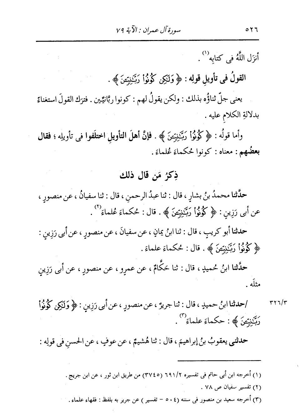 حَدَّثَنَا أَبُو كُرَيْبٍ، قَالَ: ثنا ابْنُ يَمَانٍ، عَنْ سُفْيَانَ، عَنْ مَنْصُورٍ، عَنْ أَبِي رَزِينٍ: {§كُونُوا رَبَّانِيِّينَ} [آل عمران: 79] قَالَ: «حُكَمَاءَ عُلَمَاءَ» حَدَّثَنَا ابْنُ حُمَيْدٍ، قَالَ: ثنا حَكَّامٌ، عَنْ عَمْرٍو، عَنْ مَنْصُورٍ، عَنْ أَبِي رَزِينٍ، مِثْلَهُ