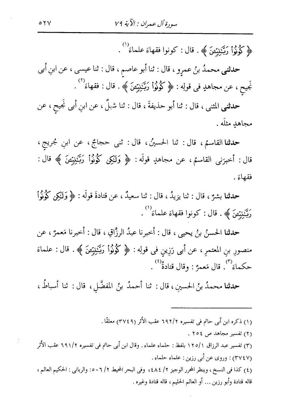 حَدَّثَنِي مُحَمَّدُ بْنُ عَمْرٍو، قَالَ: ثنا أَبُو عَاصِمٍ، قَالَ: ثنا عِيسَى، عَنِ ابْنِ أَبِي نَجِيحٍ، عَنْ مُجَاهِدٍ، فِي قَوْلِهِ: {§كُونُوا رَبَّانِيِّينَ} [آل عمران: 79] قَالَ: «فُقَهَاءَ» حَدَّثَنِي الْمُثَنَّى، قَالَ: ثنا أَبُو حُذَيْفَةَ، قَالَ: ثنا شِبْلٌ، عَنِ ابْنِ أَبِي نَجِيحٍ، عَنْ مُجَاهِدٍ، مِثْلَهُ