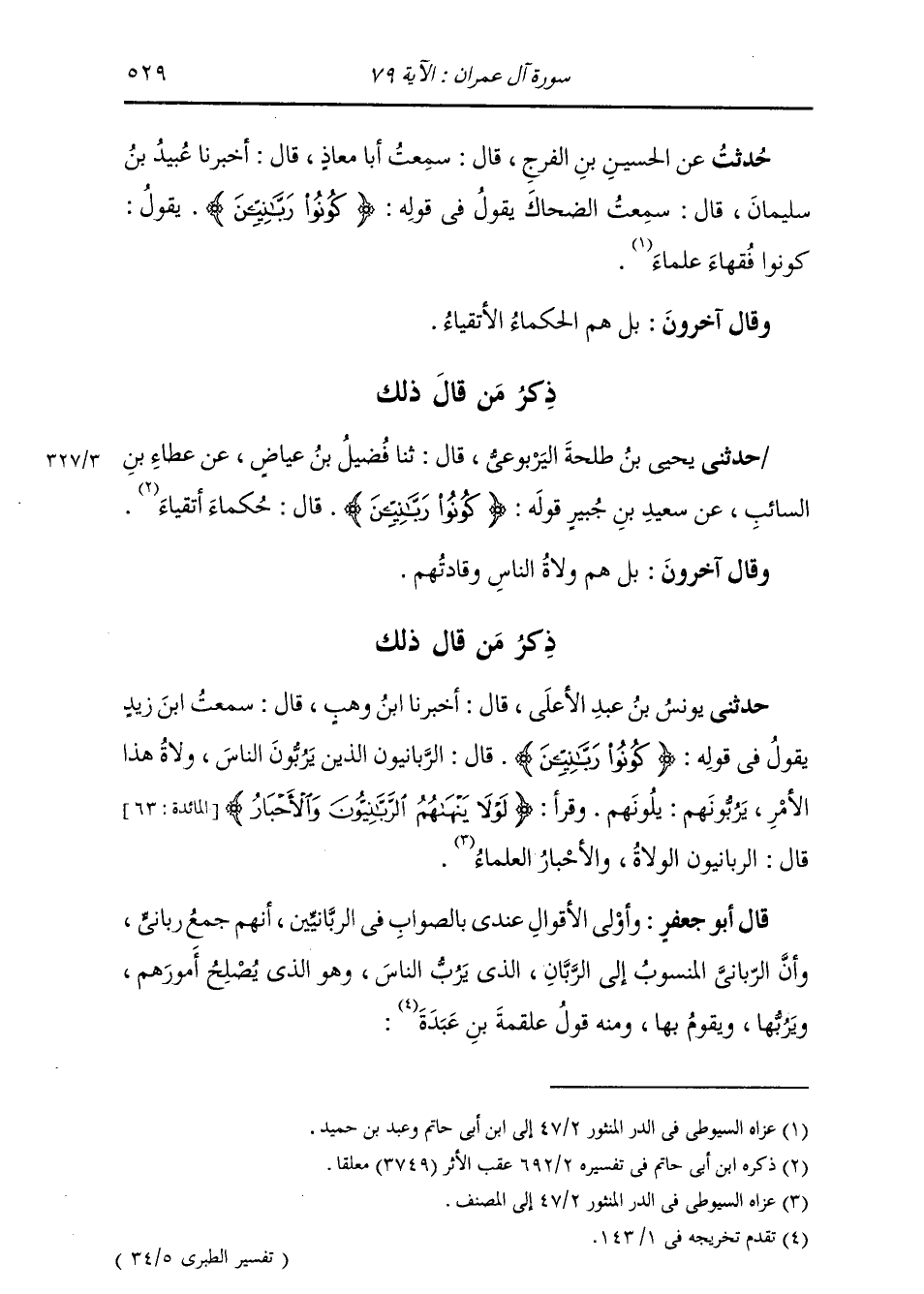 حُدِّثْتُ عَنِ الْحُسَيْنِ بْنِ الْفَرَجِ، قَالَ: سَمِعْتُ أَبَا مُعَاذٍ، قَالَ: أَخْبَرَنَا عُبَيْدُ بْنُ سُلَيْمَانَ، قَالَ: سَمِعْتُ الضَّحَّاكَ، يَقُولُ فِي قَوْلِهِ: {§كُونُوا رَبَّانِيِّينَ} [آل عمران: 79] يَقُولُ: «كُونُوا فُقَهَاءَ عُلَمَاءَ» وَقَالَ آخَرُونَ: بَلْ هُمُ الْحُكَمَاءُ الْأَتْقِيَاءُ