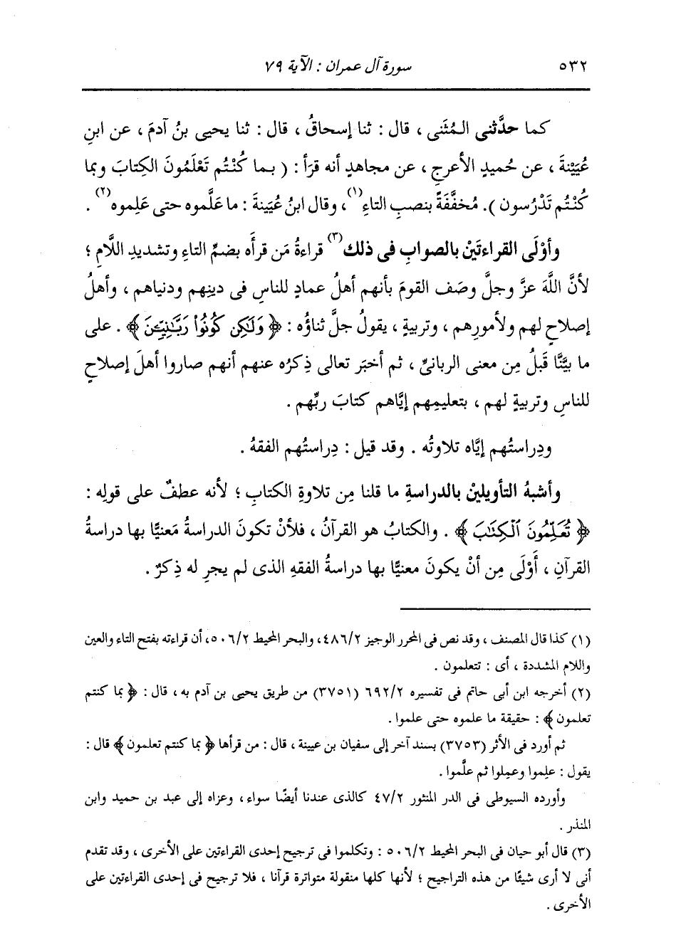 كَمَا: حَدَّثَنِي الْمُثَنَّى، قَالَ: ثنا إِسْحَاقُ، قَالَ: ثنا يَحْيَى بْنُ آدَمَ، عَنِ ابْنِ عُيَيْنَةَ، عَنْ حُمَيْدٍ الْأَعْرَجِ، عَنْ مُجَاهِدٍ، أَنَّهُ قَرَأَ: (§بِمَا كُنْتُمْ تَعْلَمُونَ الْكِتَابَ وَبِمَا كُنْتُمْ تَدْرُسُونَ) مُخَفَّفَةً بِنَصْبِ التَّاءِ، وَقَالَ ابْنُ عُيَيْنَةَ: مَا عَلَّمُوهُ حَتَّى عَلِمُوهُ " وَأَوْلَى الْقِرَاءَتَيْنِ بِالصَّوَابِ فِي ذَلِكَ قِرَاءَةُ مَنْ قَرَأَهَ بِضَمِّ التَّاءِ وَتَشْدِيدِ اللَّامِ؛ لِأَنَّ اللَّهَ عَزَّ وَجَلَّ وَصَفَ الْقَوْمَ بِأَنَّهُمْ أَهْلُ عِمَادٍ لِلنَّاسِ فِي دِينِهِمْ وَدُنْيَاهُمْ، وَأَهْلُ إِصْلَاحٍ لَهُمْ وَلِأُمُورِهِمْ وَتَرْبِيَةٍ، يَقُولُ جَلَّ ثناؤُهُ: {وَلَكِنْ كُونُوا رَبَّانِيِّينَ} [آل عمران: 79] عَلَى مَا بَيَّنَّا قَبْلُ مِنْ مَعْنَى الرَّبَّانِيِّ، ثُمَّ أَخْبَرَ تَعَالَى ذِكْرُهُ عَنْهُمْ أَنَّهُمْ صَارُوا أَهْلَ إِصْلَاحٍ لِلنَّاسٍ، وَتَرْبِيَةٍ لَهُمْ بِتَعْلِيمِهِمْ إِيَّاهُمْ كِتَابَ رَبِّهِمْ، وَدِرَاسَتُهُمْ إِيَّاهُ: تِلَاوَتُهُ، وَقَدْ قِيلَ: دِرَاسَتُهُمُ الْفِقْهُ. وَأَشْبَهُ التَّأْوِيلَيْنِ بِالدِّرَاسَةِ مَا قُلْنَا مِنْ تِلَاوَةِ الْكِتَابِ؛ لِأَنَّهُ عُطِفَ عَلَى قَوْلِهِ: {تُعَلِّمُونَ الْكِتَابَ} [آل عمران: 79] ، وَالْكِتَابُ: هُوَ الْقُرْآنُ، فَلَأَنْ تَكُونَ الدِّرَاسَةُ مَعْنِيًّا بِهَا دِرَاسَةَ الْقُرْآنِ أَوْلَى مِنْ أَنْ تَكُونَ مَعْنِيًّا بِهَا دِرَاسَةُ الْفِقْهِ الَّذِي لَمْ يَجْرِ لَهُ ذِكْرٌ