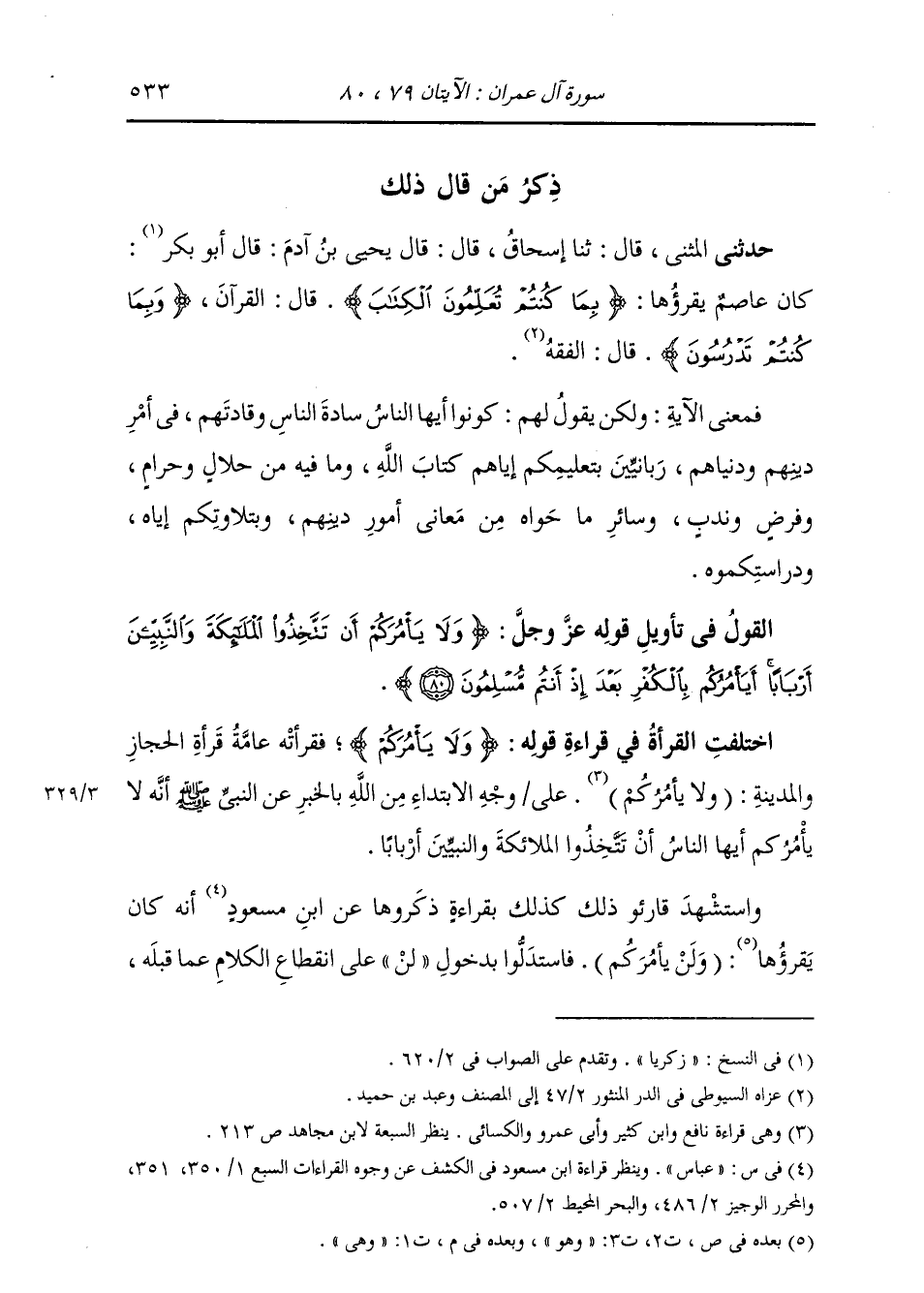 ذِكْرُ مَنْ قَالَ ذَلِكَ: حَدَّثَنِي الْمُثَنَّى، قَالَ: ثنا إِسْحَاقُ، قَالَ: قَالَ يَحْيَى بْنُ آدَمَ: قَالَ أَبُو زَكَرِيَّا: كَانَ عَاصِمٌ يَقْرَؤُهَا: {§بِمَا كُنْتُمْ تُعَلِّمُونَ الْكِتَابَ} [آل عمران: 79] قَالَ: الْقُرْآنَ، {وَبِمَا كُنْتُمْ تَدْرُسُونَ} [آل عمران: 79] قَالَ: «الْفِقْهَ» فَمَعْنَى الْآيَةِ: وَلَكِنْ يَقُولُ لَهُمْ: كُونُوا أَيُّهَا النَّاسُ سَادَةَ النَّاسِ وَقَادَتَهُمْ فِي أَمْرِ دِينِهِمْ وَدُنْيَاهُمْ، رَبَّانِيِّينَ بِتَعْلِيمِكُمْ إِيَّاهُمْ كِتَابَ اللَّهِ، وَمَا فِيهِ مِنْ حَلَالٍ وَحَرَامٍ، وَفَرْضٍ وَنَدْبٍ، وَسَائِرِ مَا حَوَاهُ مِنْ مَعَانِي أُمُورِ دِينِهِمْ، وَبِتَلَاوَتِكُمْ إِيَّاهُ وَدِرَاسَتِكُمُوهُ