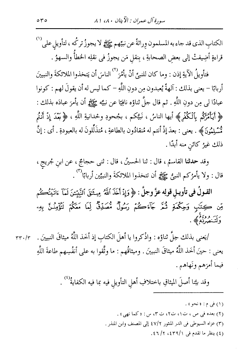 الْكِتَابِ الَّذِي جَاءَ بِهِ الْمُسْلِمُونَ وِرَاثَةً عَنْ نَبِيِّهِمْ صَلَّى اللهُ عَلَيْهِ وَسَلَّمَ لَا يَجُوزُ تَرْكُهُ لِتَأْوِيلٍ عَلَى قِرَاءَةٍ أُضِيفَتْ إِلَى بَعْضِ الصَّحَابَةِ بِنَقْلِ مَنْ يَجُوزُ فِي نَقْلِهِ الْخَطَأُ وَالسَّهْوُ. فَتَأْوِيلُ الْآيَةِ إِذًا: وَمَا كَانَ لِلنَّبِيِّ أَنْ يَأْمُرَ النَّاسَ أَنْ يَتَّخِذُوا الْمَلَائِكَةَ وَالنَّبِيِّينَ أَرْبَابًا، يَعْنِي بِذَلِكَ آلِهَةً يُعْبَدُونَ مِنْ دُونِ اللَّهِ، كَمَا لَيْسَ لَهُ أَنْ يَقُولَ لَهُمْ كُونُوا عِبَادًا لِي مِنْ دُونِ اللَّهِ، ثُمَّ قَالَ جَلَّ ثناؤُهُ نَافِيًا عَنْ نَبِيِّهِ صَلَّى اللهُ عَلَيْهِ وَسَلَّمَ أَنْ يَأْمُرَ عِبَادَهُ بِذَلِكَ: أَيَأْمُرُكُمْ بِالْكُفْرِ أَيُّهَا النَّاسُ نَبِيُّكُمْ بِجُحُودِ وَحْدَانِيَّةِ اللَّهِ بَعْدَ إِذْ أَنْتُمْ مُسْلِمُونَ، يَعْنِي بَعْدَ إِذْ أَنْتُمْ لَهُ مُنْقَادُونَ بِالطَّاعَةِ مُتَذَلِّلُونَ لَهُ بِالْعُبُودِيَّةِ، أَيْ أَنَّ ذَلِكَ غَيْرُ كَائِنٍ مِنْهُ أَبَدًا
