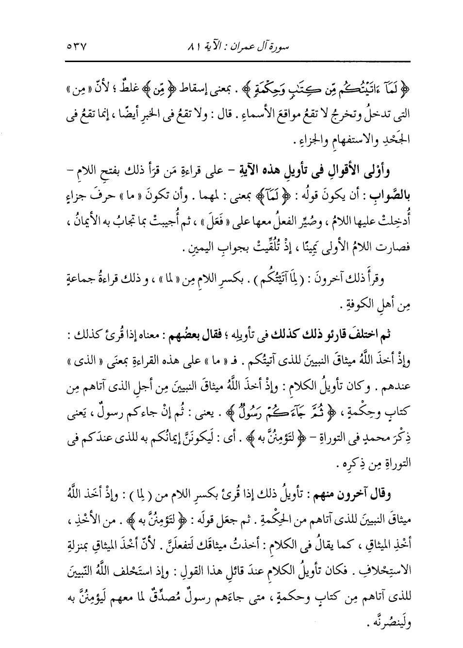 : {لَمَا آتَيْتُكُمْ مِنْ كِتَابٍ وَحِكْمَةٍ} [آل عمران: 81] بِمَعْنَى إِسْقَاطِ «مِنْ» غَلَطٌ؛ لِأَنَّ «مِنْ» الَّتِي تَدْخُلُ وَتَخْرُجُ لَا تَقَعُ مَوَاقِعَ الْأَسْمَاءِ، قَالَ: وَلَا تَقَعُ فِي الْخَبَرِ أَيْضًا، إِنَّمَا تَقَعُ فِي الْجَحْدِ وَالِاسْتِفْهَامِ وَالْجَزَاءِ. وَأَوْلَى الْأَقْوَالِ فِي تَأْوِيلِ هَذِهِ الْآيَةِ عَلَى قِرَاءَةِ مَنْ قَرَأَ ذَلِكَ بِفَتْحِ اللَّامِ بِالصَّوَابِ أَنْ يَكُونَ قَوْلُهُ: {لَمَا} [البقرة: 41] بِمَعْنَى: لَمَهْمَا، وَأَنْ تَكُونَ «مَا» حَرْفَ جَزَاءٍ أُدْخِلَتْ عَلَيْهَا اللَّامُ، وَصُيِّرَ الْفِعْلُ مَعَهَا عَلَى «فَعَلَ» ثُمَّ أُجِيبَتْ بِمَا تُجَابُ بِهِ الْأَيْمَانُ، فَصَارَتِ اللَّامُ الْأُولَى يَمِينًا إِذْ تُلُقِّيَتْ بِجَوَابِ الْيَمِينِ. وَقَرَأَ ذَلِكَ آخَرُونَ: (لِمَا آتَيْتُكُمْ) بِكَسْرِ اللَّامِ مِنْ «لِمَا» ، وَذَلِكَ قِرَاءَةُ جَمَاعَةٍ مِنْ أَهْلِ الْكُوفَةِ ثُمَّ اخْتَلَفَ قَارِئُو ذَلِكَ كَذَلِكَ فِي تَأْوِيلِهِ، فَقَالْ بَعْضُهُمْ: مَعْنَاهُ إِذَا قُرِئَ كَذَلِكَ: وَإِذْ أَخَذَ اللَّهُ مِيثَاقَ النَّبِيِّينَ لِلَّذِي آتَيْتُكُمْ، فَمَا عَلَى هَذِهِ الْقِرَاءَةِ بِمَعْنَى: الَّذِي عِنْدَهُمْ. وَكَانَ تَأْوِيلُ الْكَلَامِ: وَإِذْ أَخَذَ اللَّهُ مِيثَاقَ النَّبِيِّينَ مِنْ أَجْلِ الَّذِي آتَاهُمْ مِنْ كِتَابٍ وَحِكْمَةٍ، ثُمَّ جَاءَكُمْ رَسُولٌ: يَعْنِي: ثُمَّ إِنْ جَاءَكُمْ رَسُولٌ، يَعْنِي ذِكْرَ مُحَمَّدٍ فِي التَّوْرَاةِ، لَتُؤْمِنُنَّ بِهِ، أَيْ لَيَكُونَنَّ إِيمَانُكُمْ بِهِ لِلَّذِي عِنْدَكُمْ فِي التَّوْرَاةِ مِنْ ذِكْرِهِ. وَقَالَ آخَرُونَ مِنْهُمْ: تَأْوِيلُ ذَلِكَ إِذَا قُرِئَ بِكَسْرِ اللَّامِ مِنْ «لَمَا» ، وَإِذْ أَخَذَ اللَّهُ مِيثَاقَ النَّبِيِّينَ لِلَّذِي آتَاهُمْ مِنَ الْحِكْمَةِ، ثُمَّ جُعِلَ قَوْلُهُ: لَتُؤْمِنُنَّ بِهِ مِنَ الْأَخْذِ، أَخْذِ الْمِيثَاقِ، كَمَا يُقَالُ فِي الْكَلَامِ: أَخَذْتُ مِيثَاقَكَ لَتَفْعَلَنَّ لِأَنَّ أَخْذَ الْمِيثَاقِ بِمَنْزِلَةِ الِاسْتِحْلَافِ، فَكَانَ تَأْوِيلُ الْكَلَامِ عِنْدَ قَائِلِ هَذَا الْقَوْلِ: وَإِذَا اسْتَحْلَفَ اللَّهُ النَّبِيِّينَ لِلَّذِي آتَاهُمْ مِنْ كِتَابٍ وَحِكْمَةٍ، مَتَى جَاءَهُمْ رَسُولٌ مُصَدِّقٌ لِمَا مَعَهُمْ لَيُؤْمِنُنَّ بِهِ وَلَيَنْصُرُنَّهُ.