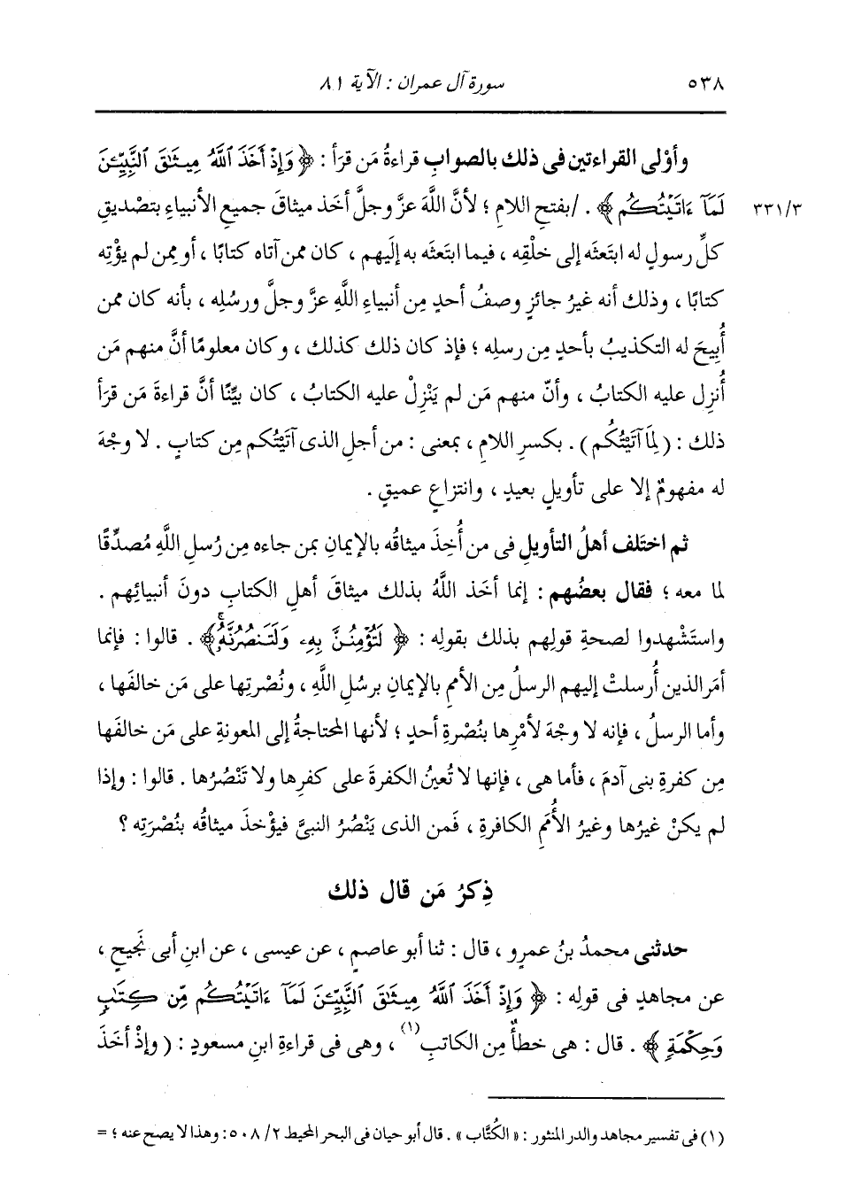 وَأَوْلَى الْقِرَاءَتَيْنِ فِي ذَلِكَ بِالصَّوَابِ قِرَاءَةُ مَنْ قَرَأَ: {وَإِذْ أَخَذَ اللَّهُ مِيثَاقَ النَّبِيِّينَ لَمَا آتَيْتُكُمْ} [آل عمران: 81] بِفَتْحِ اللَّامِ، لِأَنَّ اللَّهَ عَزَّ وَجَلَّ أَخَذَ مِيثَاقَ جَمِيعِ الْأَنْبِيَاءِ بِتَصْدِيقِ كُلِّ رَسُولٍ لَهُ ابْتَعَثَهُ إِلَى خَلْقِهِ فِيمَا ابْتَعَثَهُ بِهِ إِلَيْهِمْ، كَانَ مِمَّنْ آتَاهُ كِتَابًا، أَوْ مَنْ لَمْ يُؤْتِهِ كِتَابًا، وَذَلِكَ أَنَّهُ غَيْرُ جَائِزٍ وَصْفُ أَحَدٍ مِنْ أَنْبِيَاءِ اللَّهِ عَزَّ وَجَلَّ وَرُسُلِهِ، بِأَنَّهُ كَانَ مِمَّنْ أُبِيحَ لَهُ التَّكْذِيبُ بِأَحَدٍ مِنْ رُسُلِهِ، فَإِذَا كَانَ ذَلِكَ كَذَلِكَ، وَكَانَ مَعْلُومًا أَنَّ مِنْهُمُ مَنْ أُنْزِلَ عَلَيْهِ الْكِتَابُ، وَأَنَّ مِنْهُمْ مَنْ لَمْ يُنْزَلْ عَلَيْهِ الْكِتَابُ، كَانَ بَيِّنًّا أَنَّ قِرَاءَةَ مَنْ قَرَأَ ذَلِكَ: (لِمَا آتَيْتُكُمْ) بِكَسْرِ اللَّامِ، بِمَعْنَى: مِنْ أَجْلِ الَّذِي آتَيْتُكُمْ مِنْ كِتَابٍ، لَا وَجْهَ لَهُ مَفْهُومٌ إِلَّا عَلَى تَأْوِيلٍ بَعِيدٍ، وَانْتِزَاعٍ عَمِيقٍ. ثُمَّ اخْتَلَفَ أَهْلُ التَّأْوِيلِ فِيمَنْ أُخِذَ مِيثَاقُهُ بِالْإِيمَانِ بِمَنْ جَاءَهُ مِنْ رُسُلِ اللَّهِ مُصَدِّقًا لِمَا مَعَهُ، فَقَالَ بَعْضُهُمْ: إِنَّمَا أَخَذَ اللَّهُ بِذَلِكَ مِيثَاقَ أَهْلِ الْكِتَابِ، دُونَ أَنْبِيَائِهِمْ، وَاسْتَشْهَدُوا لِصِحَّةِ قَوْلِهِمْ بِذَلِكَ بِقَوْلِهِ: {لَتُؤْمِنُنَّ بِهِ وَلَتَنْصُرُنَّهُ} [آل عمران: 81] قَالُوا: فَإِنَّمَا أُمِرَ الَّذِينَ أُرْسِلَتْ إِلَيْهِمُ الرُّسُلُ مِنَ الْأُمَمِ بِالْإِيمَانِ بِرُسُلِ اللَّهِ، وَنُصْرَتِهَا عَلَى مَنْ خَالَفَهَا، وَأَمَّا الرُّسُلُ فَإِنَّهُ لَا وَجْهَ لِأَمْرِهَا بِنُصْرَةِ أَحَدٍ؛ لِأَنَّهَا الْمُحْتَاجَةُ إِلَى الْمَعُونَةِ عَلَى مَنْ خَالَفَهَا مِنْ كَفَرَةِ بَنِي آدَمَ، فَأَمَّا هِيَ فَإِنَّهَا لَا تُعِينُ الْكَفَرَةَ عَلَى كُفْرِهَا وَلَا تُنْصُرُهَا، قَالُوا: وَإِذَا لَمْ يَكُنْ غَيْرُهَا وَغَيْرُ الْأُمَمِ الْكَافِرَةِ، فَمَنِ الَّذِي يَنْصُرُ النَّبِيَّ، فَيُؤْخَذُ مِيثَاقُهُ بِنُصْرَتِهِ؟