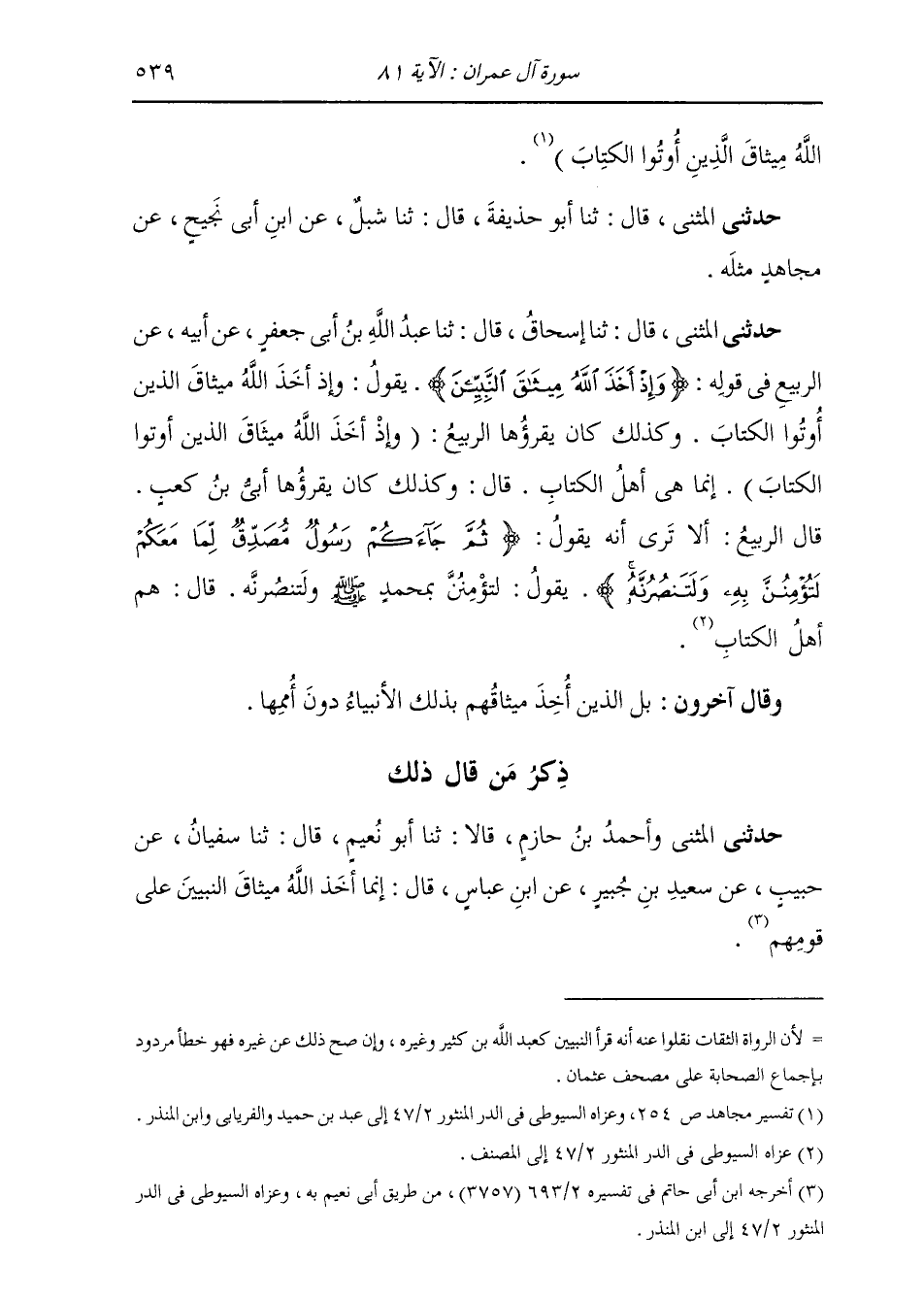 ذِكْرُ مَنْ قَالَ ذَلِكَ: حَدَّثَنِي الْمُثَنَّى، وَأَحْمَدُ بْنُ حَازِمٍ، قَالَا: ثنا أَبُو نُعَيْمٍ، قَالَ: ثنا سُفْيَانُ، عَنْ حَبِيبٍ، عَنْ سَعِيدِ بْنِ جُبَيْرٍ، عَنِ ابْنِ عَبَّاسٍ، قَالَ: «إِنَّمَا §أَخَذَ اللَّهُ مِيثَاقَ النَّبِيِّينَ عَلَى قَوْمِهِمْ»