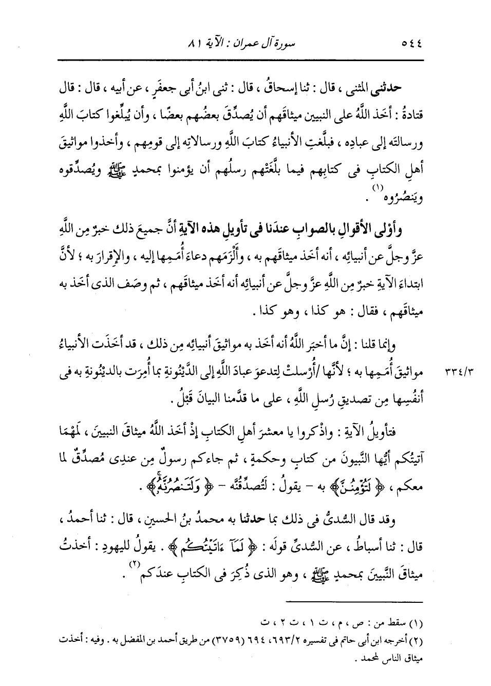 حَدَّثَنِي الْمُثَنَّى، قَالَ: ثنا إِسْحَاقُ، قَالَ: ثني ابْنُ أَبِي جَعْفَرٍ، عَنْ أَبِيهِ، قَالَ: قَالَ قَتَادَةُ: «§أَخَذَ اللَّهُ عَلَى النَّبِيِّينَ مِيثَاقَهُمْ أَنْ يُصَدِّقَ بَعْضُهُمْ بَعْضًا، وَأَنْ يُبَلِّغُوا كِتَابَ اللَّهِ وَرِسَالَتَهُ إِلَى عِبَادِهِ، فَبَلَّغَتِ الْأَنْبِيَاءُ كِتَابَ اللَّهِ وَرِسَالَاتِهِ إِلَى قَوْمِهِمْ، وَأَخَذُوا مَوَاثِيقَ أَهْلِ الْكِتَابِ فِي كِتَابِهِمْ، فِيمَا بَلَّغَتْهُمْ رُسُلُهُمْ أَنْ يُؤْمِنُوا بِمُحَمَّدٍ صَلَّى اللهُ عَلَيْهِ وَسَلَّمَ، وَيُصَدِّقُوهُ وَيَنْصُرُوهُ» وَأَوْلَى الْأَقْوَالِ بِالصَّوَابِ عِنْدَنَا فِي تَأْوِيلِ هَذِهِ الْآيَةِ: أَنَّ جَمِيعَ ذَلِكَ خَبَرٌ مِنَ اللَّهِ عَزَّ وَجَلَّ عَنْ أَنْبِيَائِهِ أَنَّهُ أَخَذَ مِيثَاقَهُمْ بِهِ، وَأَلْزَمَهُمْ دُعَاءَ أُمَمِهِمْ إِلَيْهِ وَالْإِقْرَارَ بِهِ؛ لِأَنَّ ابْتِدَاءَ الْآيَةِ خَبَرٌ مِنَ اللَّهِ عَزَّ وَجَلَّ عَنْ أَنْبِيَائِهِ أَنَّهُ أَخَذَ مِيثَاقَهُمْ، ثُمَّ وَصَفَ الَّذِي أَخَذَ بِهِ مِيثَاقَهُمْ، فَقَالَ: هُوَ كَذَا وَهُوَ كَذَا. وَإِنَّمَا قُلْنَا إِنَّ مَا أَخْبَرَ اللَّهُ أَنَّهُ أَخَذَ بِهِ مَوَاثِيقَ أَنْبِيَائِهِ مِنْ ذَلِكَ، قَدْ أَخَذَتِ الْأَنْبِيَاءُ مَوَاثِيقَ أُمَمِهَا بِهِ؛ لِأَنَّهَا أُرْسِلَتْ لِتَدْعُوَ عِبَادَ اللَّهِ إِلَى الدَّيْنُونَةِ، بِمَا أُمِرَتْ بِالدَّيْنُونَةِ بِهِ فِي أَنْفُسِهَا مِنْ تَصْدِيقِ رُسُلِ اللَّهِ عَلَى مَا قَدَّمْنَا الْبَيَانَ قَبْلُ، فَتَأْوِيلُ الْآيَةِ: وَاذْكُرُوا يَا مَعْشَرَ أَهْلِ الْكِتَابِ إِذْ أَخَذَ اللَّهُ مِيثَاقَ النَّبِيِّينَ لَمَهْمَا آتَيْتُكُمْ أَيُّهَا النَّبِيُّونَ مِنْ كِتَابٍ وَحِكْمَةٍ، ثُمَّ جَاءَكُمْ رَسُولٌ مِنْ عِنْدِي مُصَدِّقٌ لِمَا مَعَكُمْ لَتُؤْمِنُنَّ بِهِ، يَقُولُ: لَتُصَدِّقُنَّهُ وَلَتَنْصُرُنَّهُ، وَقَدْ قَالَ السُّدِّيُّ فِي ذَلِكَ بِمَا: