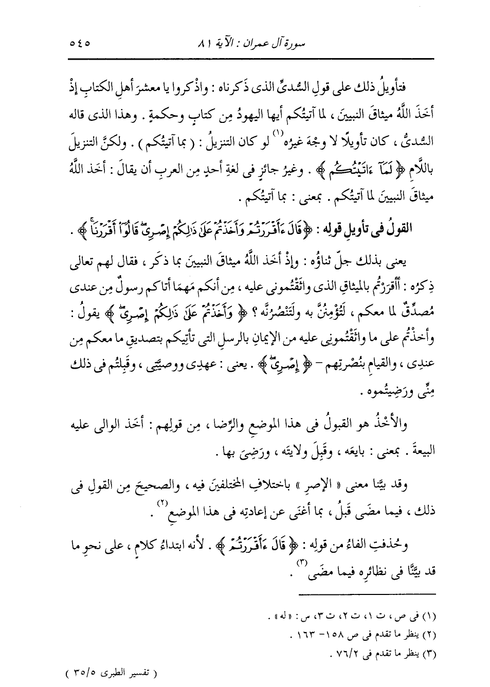 §الْقَوْلُ فِي تَأْوِيلِ قَوْلِهِ تَعَالَى: {قَالَ أَأَقْرَرْتُمْ وَأَخَذْتُمْ عَلَى ذَلِكُمْ إِصْرِي قَالُوا أَقْرَرْنَا} [آل عمران: 81] يَعْنِي بِذَلِكَ جَلَّ ثناؤُهُ: وَإِذْ أَخَذَ اللَّهُ مِيثَاقَ النَّبِيِّينَ بِمَا ذَكَرَ، فَقَالَ لَهُمْ تَعَالَى ذِكْرُهُ: أَأَقْرَرْتُمْ بِالْمِيثَاقِ الَّذِي وَاثَقْتُمُونِي عَلَيْهِ مِنْ أَنَّكُمْ مَهْمَا أَتَاكُمْ رَسُولٌ مِنْ عِنْدِي، مُصَدِّقٌ لَمَا مَعَكُمْ، لَتُؤْمِنُنَّ بِهِ وَلَتَنْصُرُنَّهُ {وَأَخَذْتُمْ عَلَى ذَلِكُمْ إِصْرِي} [آل عمران: 81] يَقُولُ: وَأَخَذْتُمْ عَلَى مَا وَاثَقْتُمُونِي عَلَيْهِ مِنَ الْإِيمَانِ بِالرُّسُلِ الَّتِي تَأْتِيكُمْ بِتَصْدِيقِ مَا مَعَكُمْ مِنْ عِنْدِي، وَالْقِيَامِ بِنُصْرَتِهِمْ إِصْرِي، يَعْنِي عَهْدِي وَوَصِيَّتِي، وَقَبِلْتُمْ فِي ذَلِكَ مِنِّي وَرَضِيتُمُوهُ، وَالْأَخْذُ: هُوَ الْقَبُولُ فِي هَذَا الْمَوْضِعِ، وَالرِّضَا مِنْ قَوْلِهِمْ: أَخَذَ الْوَالِي عَلَيْهِ الْبَيْعَةَ، بِمَعْنَى: بَايَعَهُ، وَقَبِلَ وِلَايَتَهُ، وَرَضِيَ بِهَا. وَقَدْ بَيَّنَّا مَعْنَى الْإِصْرِ بِاخْتِلَافِ الْمُخْتَلِفِينَ فِيهِ، وَالصَّحِيحُ مِنَ الْقَوْلِ فِي ذَلِكَ فِيمَا مَضَى قَبْلُ بِمَا أَغْنَى عَنْ إِعَادَتِهِ فِي هَذَا الْمَوْضِعِ، وَحُذِفَتِ الْفَاءُ مِنْ قَوْلِهِ: {قَالَ أَأَقْرَرْتُمْ} [آل عمران: 81] لِأَنَّهُ ابْتِدَاءُ كَلَامٍ عَلَى نَحْوِ مَا قَدْ بَيَّنَّا فِي نَظَائِرِهِ فِيمَا مَضَى،
