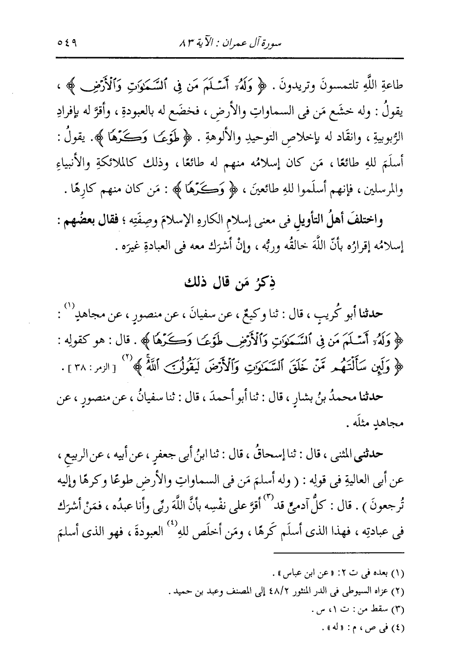ذِكْرُ مَنْ قَالَ ذَلِكَ: حَدَّثَنَا أَبُو كُرَيْبٍ، قَالَ: ثنا وَكِيعٌ، عَنْ سُفْيَانَ، عَنْ مَنْصُورٍ، عَنْ مُجَاهِدٍ: {§وَلَهُ أَسْلَمَ مَنْ فِي السَّمَوَاتِ وَالْأَرْضِ} قَالَ: هُوَ كَقَوْلِهِ: {وَلَئِنْ سَأَلْتَهُمْ مَنْ خَلَقَ السَّمَوَاتِ وَالْأَرْضَ لَيَقُولُنَّ اللَّهُ} حَدَّثَنَا مُحَمَّدُ بْنُ بَشَّارٍ قَالَ: ثنا أَبُو أَحْمَدَ، قَالَ: ثنا سُفْيَانُ، عَنْ مَنْصُورٍ، عَنْ مُجَاهِدٍ، مِثْلَهُ