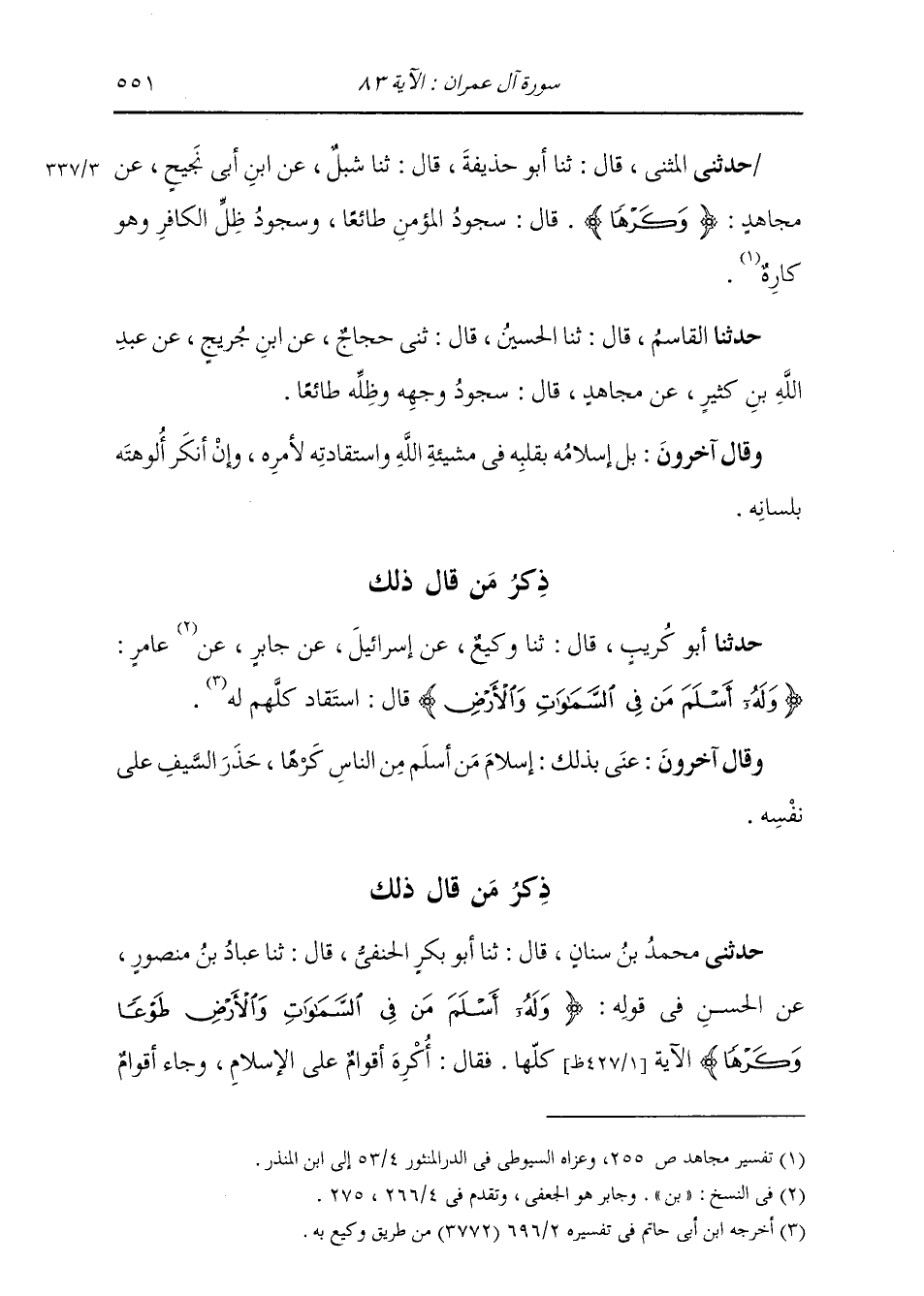 ذِكْرُ مَنْ قَالَ ذَلِكَ: حَدَّثَنَا أَبُو كُرَيْبٍ، قَالَ: ثنا وَكِيعٌ، عَنْ إِسْرَائِيلَ، عَنْ جَابِرٍ، عَنْ عَامِرٍ: {§وَلَهُ أَسْلَمَ مَنْ فِي السَّمَوَاتِ وَالْأَرْضِ} قَالَ: «اسْتَقَادَ كُلَّهُمْ لَهُ» وَقَالَ آخَرُونَ: عَنَى بِذَلِكَ إِسْلَامَ مَنْ أَسْلَمَ مِنَ النَّاسِ كَرْهًا حَذَرَ السَّيْفِ عَلَى نَفْسِهِ