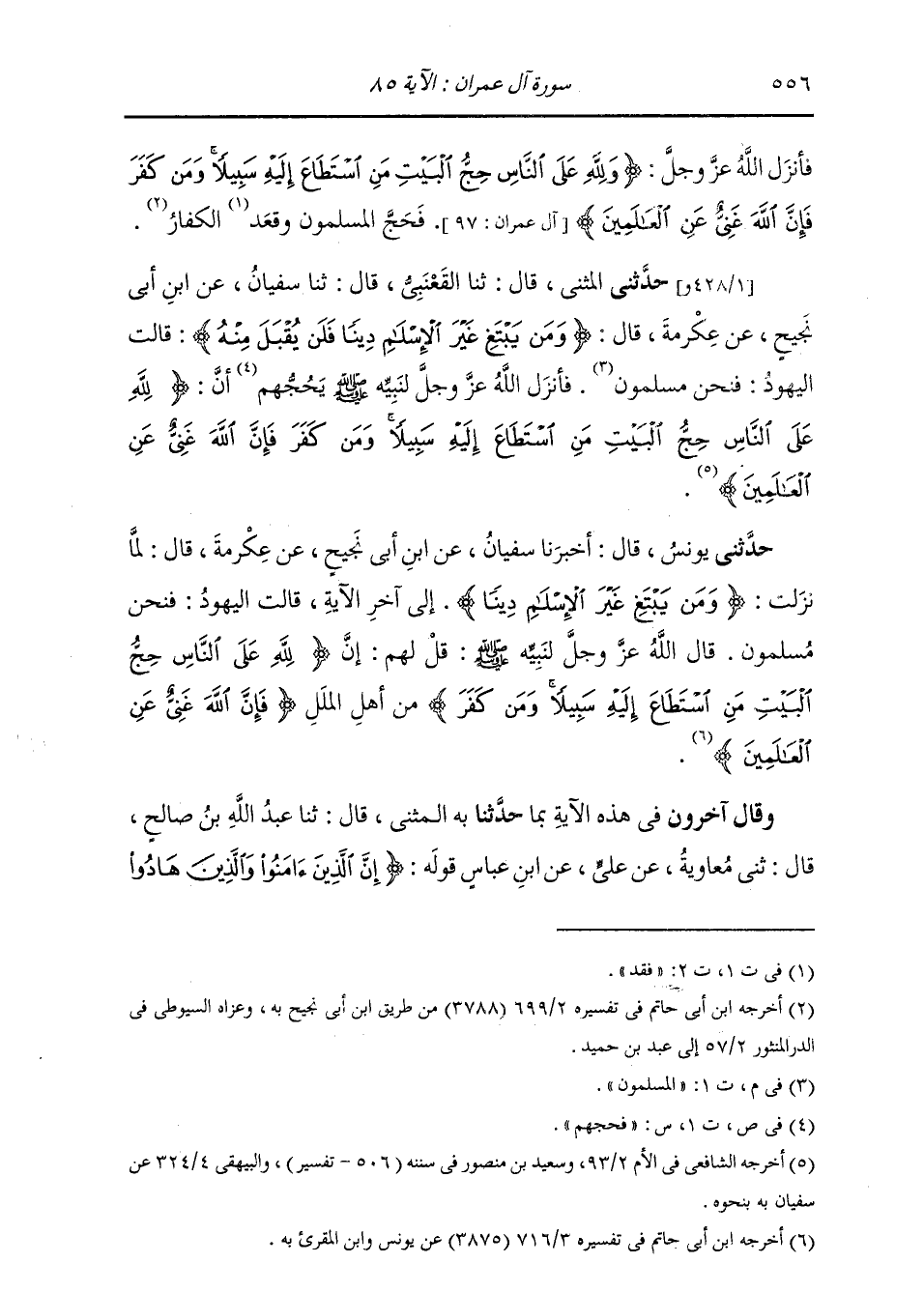 حَدَّثَنَا الْمُثَنَّى، قَالَ: ثنا الْقَعْنَبِيُّ، قَالَ: ثنا سُفْيَانُ، عَنِ ابْنِ أَبِي نَجِيحٍ، عَنْ عِكْرِمَةَ، قَالَ: {§وَمَنْ يَبْتَغِ غَيْرَ الْإِسْلَامِ دِينًا فَلَنْ يُقْبَلَ مِنْهُ} [آل عمران: 85] " قَالَتِ الْيَهُودُ: فَنَحْنُ الْمُسْلِمُونَ، فَأَنْزَلَ اللَّهُ عَزَّ وَجَلَّ لِنَبِيِّهِ صَلَّى اللهُ عَلَيْهِ وَسَلَّمَ يُحِجُّهُمْ أَنَّ " {لِلَّهِ عَلَى النَّاسِ حَجُّ الْبَيْتِ مَنِ اسْتَطَاعَ إِلَيْهِ سَبِيلًا وَمَنْ كَفَرَ فَإِنَّ اللَّهَ غَنِيُّ عَنِ الْعَالَمِينَ} [آل عمران: 97]