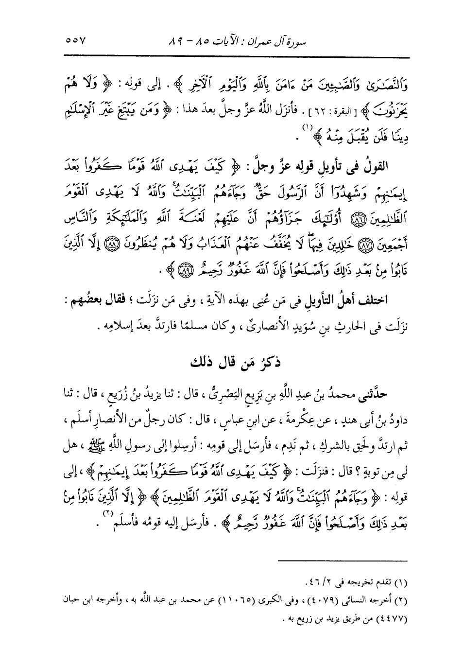 §الْقَوْلُ فِي تَأْوِيلِ قَوْلِهِ تَعَالَى: {كَيْفَ يَهْدِي اللَّهُ قَوْمًا كَفَرُوا بَعْدَ إِيمَانِهِمْ وَشَهِدُوا أَنَّ الرَّسُولَ حَقٌّ وَجَاءَهُمُ الْبَيِّنَاتُ وَاللَّهُ لَا يَهْدِي الْقَوْمَ الظَّالِمِينَ أُولَئِكَ جَزَاؤُهُمْ أَنَّ عَلَيْهِمْ لَعْنَةَ اللَّهِ وَالْمَلَائِكَةِ وَالنَّاسِ أَجْمَعِينَ خَالِدِينَ فِيهَا لَا يُخَفَّفُ عَنْهُمُ الْعَذَابُ وَلَا هُمْ يُنْظَرُونَ إِلَّا الَّذِينَ تَابُوا مِنْ بَعْدِ ذَلِكَ وَأَصْلَحُوا فَإِنَّ اللَّهَ غَفُورٌ رَحِيمٌ} [آل عمران: 87] اخْتَلَفَ أَهْلُ التَّأْوِيلِ فِيمَنْ عَنَى بِهَذِهِ الْآيَةِ، وَفِيمَنْ نَزَلَتْ، فَقَالَ بَعْضُهُمْ: نَزَلَتْ فِي الْحَارِثِ بْنِ سُوَيْدٍ الْأَنْصَارِيِّ، وَكَانَ مُسْلِمًا، فَارْتَدَّ بَعْدَ إِسْلَامِهِ