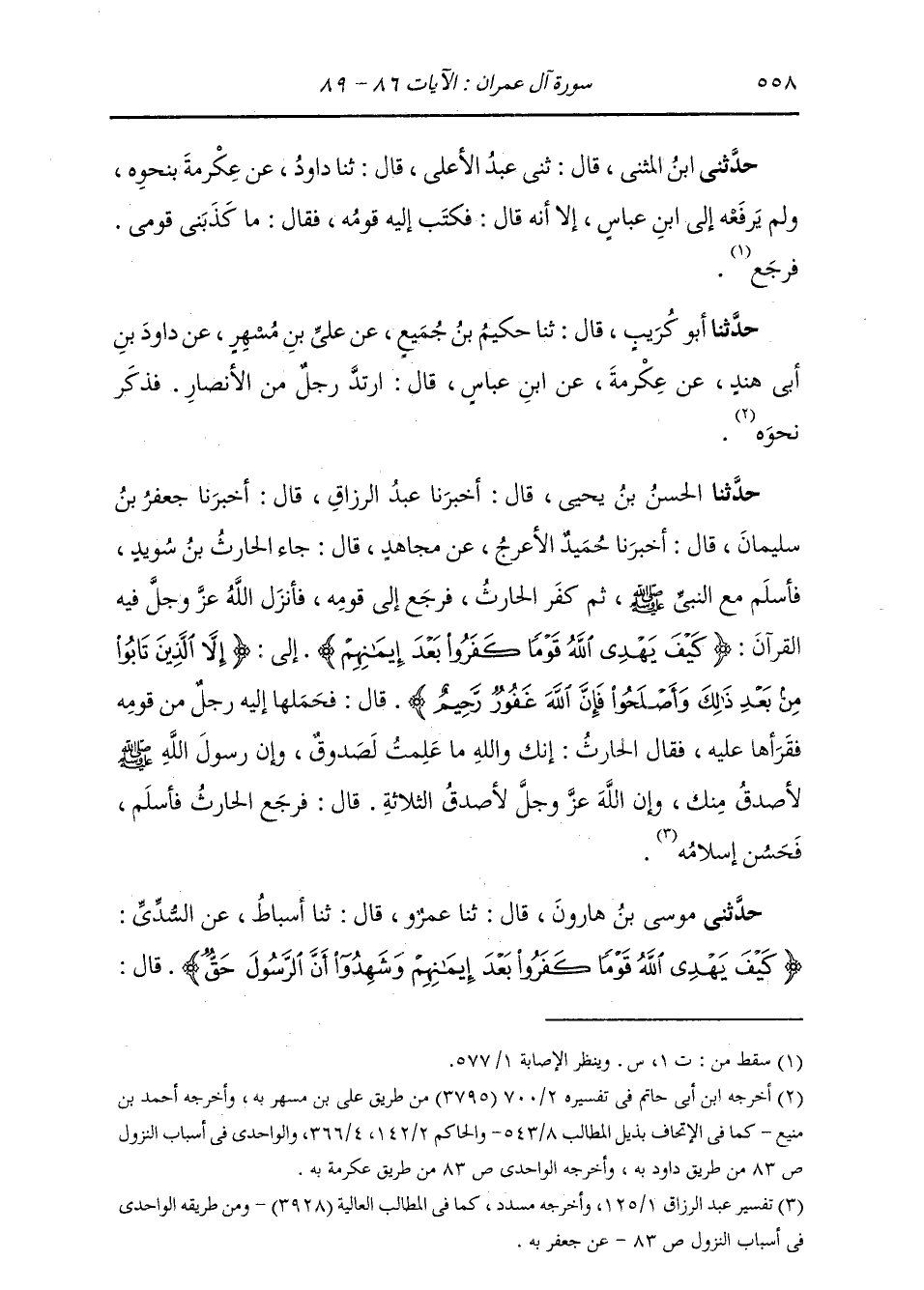 حَدَّثَنِي مُوسَى بْنُ هَارُونَ، قَالَ: ثنا عَمْرٌو، قَالَ: ثنا أَسْبَاطٌ، عَنِ السُّدِّيِّ: {§كَيْفَ يَهْدِي اللَّهُ قَوْمًا كَفَرُوا بَعْدَ إِيمَانِهِمْ وَشَهِدُوا أَنَّ الرَّسُولَ حَقٌّ} [آل عمران: 86] قَالَ: " -[559]- أُنْزِلَتْ فِي الْحَارِثِ بْنِ سُوَيْدٍ الْأَنْصَارِيِّ كَفَرَ بَعْدَ إِيمَانِهِ، فَأَنْزَلَ اللَّهُ عَزَّ وَجَلَّ فِيهِ هَذِهِ الْآيَاتِ، إِلَى: أُولَئِكَ أَصْحَابُ النَّارِ هُمْ فِيهَا خَالِدُونَ. ثُمَّ تَابَ وَأَسْلَمَ، فَنَسَخَهَا اللَّهُ عَنْهُ، قَالَ: {إِلَّا الَّذِينَ تَابُوا مِنْ بَعْدِ ذَلِكَ وَأَصْلَحُوا فَإِنَّ اللَّهَ غَفُورٌ رَحِيمٌ} [آل عمران: 89] "