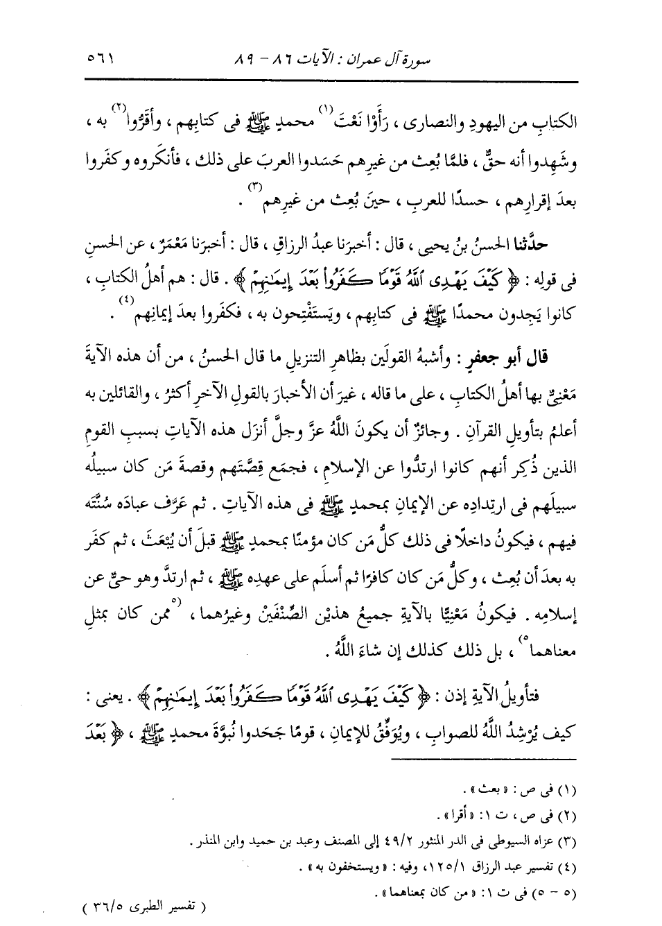 حَدَّثَنَا الْحَسَنُ بْنُ يَحْيَى، قَالَ: أَخْبَرَنَا عَبْدُ الرَّزَّاقِ، قَالَ: أَخْبَرَنَا مَعْمَرٌ، عَنِ الْحَسَنِ، فِي قَوْلِهِ: {§كَيْفَ يَهْدِي اللَّهُ قَوْمًا كَفَرُوا بَعْدَ إِيمَانِهِمْ} [آل عمران: 86] قَالَ: «هُمْ أَهْلُ الْكِتَابِ؛ كَانُوا يَجِدُونَ مُحَمَّدًا صَلَّى اللهُ عَلَيْهِ وَسَلَّمَ فِي كِتَابِهِمْ، وَيَسْتَفْتُحِوُنَ بِهِ، فَكَفَرُوا بَعْدَ إِيمَانِهِمْ» قَالَ أَبُو جَعْفَرٍ: وَأَشْبَهُ الْقَوْلَيْنِ بِظَاهِرِ التَّنْزِيلِ مَا قَالَ الْحَسَنُ، مِنْ أَنَّ هَذِهِ الْآيَةَ مَعْنِيُّ بِهَا أَهْلُ الْكِتَابِ عَلَى مَا قَالَ، غَيْرَ أَنَّ الْأَخْبَارَ بِالْقَوْلِ الْآخَرِ أَكْثَرُ، وَالْقَائِلِينَ بِهِ أَعْلَمُ بِتَأْوِيلِ الْقُرْآنِ، وَجَائِزٌ أَنْ يَكُونَ اللَّهُ عَزَّ وَجَلَّ أَنْزَلَ هَذِهِ الْآيَاتِ بِسَبَبِ الْقَوْمِ الَّذِينَ ذُكِرَ أَنَّهُمْ كَانُوا ارْتَدُّوا عَنِ الْإِسْلَامِ، فَجَمَعَ قِصَّتَهُمْ وَقِصَّةَ مَنْ كَانَ سَبِيلُهُ سَبِيلَهُمْ فِي ارْتِدَادِهِ عَنِ الْإِيمَانِ بِمُحَمَّدٍ صَلَّى اللهُ عَلَيْهِ وَسَلَّمَ فِي هَذِهِ الْآيَاتِ، ثُمَّ عَرَّفَ عِبَادَهُ سُنَّتَهُ فِيهِمْ، فَيَكُونُ دَاخِلًا فِي ذَلِكَ كُلُّ مَنْ كَانَ مُؤْمِنًا بِمُحَمَّدٍ صَلَّى اللهُ عَلَيْهِ وَسَلَّمَ قَبْلَ أَنْ يُبْعَثَ، ثُمَّ كَفَرَ بِهِ بَعْدَ أَنْ بُعِثَ، وَكُلُّ مَنْ كَانَ كَافِرًا ثُمَّ أَسْلَمَ عَلَى عَهْدِهِ صَلَّى اللهُ عَلَيْهِ وَسَلَّمَ ثُمَّ ارْتَدَّ وَهُوَ حَيُّ عَنْ إِسْلَامِهِ، فَيَكُونُ مَعْنِيًّا بِالْآيَةِ جَمِيعُ هَذَيْنِ الصِّنْفَيْنِ وَغَيْرُهُمَا مِمَّنْ كَانَ بِمِثْلِ مَعْنَاهُمَا، بَلْ ذَلِكَ كَذَلِكَ إِنْ شَاءَ اللَّهُ. فَتَأْوِيلُ الْآيَةِ إِذًا: {كَيْفَ يَهْدِي اللَّهُ قَوْمًا كَفَرُوا بَعْدَ إِيمَانِهِمْ} [آل عمران: 86] يَعْنِي: كَيْفَ يُرْشِدُ اللَّهُ لِلصَّوَابِ، وَيُوَفِّقُ لِلْإِيمَانِ قَوْمًا جَحَدُوا نُبُوَّةَ مُحَمَّدٍ صَلَّى اللهُ عَلَيْهِ وَسَلَّمَ، بَعْدَ -[562]- إِيمَانِهِمْ: أَيْ بَعْدَ تَصْدِيقِهِمْ إِيَّاهُ، وَإِقْرَارِهِمْ بِمَا جَاءَهُمْ بِهِ مِنْ عِنْدِ رَبِّهِ {وَشَهِدُوا أَنَّ الرَّسُولَ حَقٌّ} [آل عمران: 86] يَقُولُ: وَبَعْدَ أَنْ أَقَرُّوا أَنَّ مُحَمَّدًا رَسُولُ اللَّهِ صَلَّى اللهُ عَلَيْهِ وَسَلَّمَ إِلَى خَلْقِهِ حَقًّا {وَجَاءَهُمُ الْبَيِّنَاتُ} [آل عمران: 86] يَعْنِي: وَجَاءَهُمُ الْحُجَجُ مِنْ عِنْدِ اللَّهِ، وَالدَّلَائِلُ بِصِحَّةِ ذَلِكَ. {وَاللَّهُ لَا يَهْدِي الْقَوْمَ الظَّالِمِينَ} [آل عمران: 86] يَقُولُ: وَاللَّهُ لَا يُوَفِّقُ لِلْحَقِّ وَالصَّوَابِ الْجَمَاعَةَ الظَّلَمَةَ، وَهُمُ الَّذِينَ بَدَّلُوا الْحَقَّ إِلَى الْبَاطِلِ، فَاخْتَارُوا الْكُفْرَ عَلَى الْإِيمَانِ. وَقَدْ دَلَّلْنَا فِيمَا مَضَى قَبْلُ عَلَى مَعْنَى الظُّلْمِ، وَأَنَّهُ وَضْعُ الشَّيْءِ فِي غَيْرِ مَوْضِعِهِ بِمَا أَغْنَى عَنْ إِعَادَتِهِ. {أُولَئِكَ جَزَاؤُهُمْ} [آل عمران: 87] يَعْنِي: هَؤُلَاءِ الَّذِينَ كَفَرُوا بَعْدَ إِيمَانِهِمْ، وَبَعْدَ أَنْ شَهِدُوا أَنَّ الرَّسُولَ حَقٌّ {جَزَاؤُهُمْ} [آل عمران: 87] ثَوَابُهُمْ مِنْ عَمَلِهِمُ الَّذِي عَمِلُوهُ {أَنَّ عَلَيْهِمْ لَعْنَةَ اللَّهِ} [آل عمران: 87] يَعْنِي أَنْ حَلَّ بِهِمْ مِنَ اللَّهِ الْإِقْصَاءُ وَالْبُعْدُ، وَمِنَ الْمَلَائِكَةِ وَالنَّاسِ إِلَّا مِمَّا يَسُوءُهُمْ مِنَ الْعِقَابِ {أَجْمَعِينَ} [آل عمران: 87] يَعْنِي مِنْ جَمِيعِهِمْ: لَا بَعْضَ مَنْ سَمَّاهُ جَلَّ ثناؤُهُ مِنَ الْمَلَائِكَةِ وَالنَّاسِ، وَلَكِنْ مِنْ جَمِيعِهِمْ، وَإِنَّمَا جَعَلَ ذَلِكَ جَلَّ ثناؤُهُ ثَوَابَ عَمَلِهِمْ؛ لِأَنَّ عَمَلَهُمْ كَانَ بِاللَّهِ كُفْرًا، وَقَدْ بَيَّنَّا صِفَةَ لَعْنَةِ النَّاسِ ال