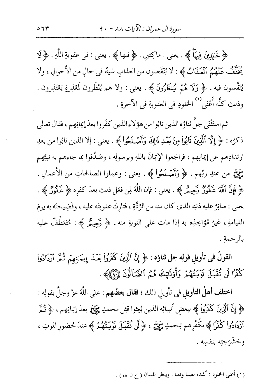 §الْقَوْلُ فِي تَأْوِيلِ قَوْلِهِ تَعَالَى: {إِنَّ الَّذِينَ كَفَرُوا بَعْدَ إِيمَانِهِمْ ثُمَّ ازْدَادُوا كُفْرًا لَنْ تُقْبَلَ تَوْبَتُهُمْ وَأُولَئِكَ هُمُ الضَّالُّونَ} [آل عمران: 90] اخْتَلَفَ أَهْلُ التَّأْوِيلِ فِي تَأْوِيلِ ذَلِكَ، فَقَالَ بَعْضُهُمْ: عَنَى اللَّهُ عَزَّ وَجَلَّ بِقَوْلِهِ: {إِنَّ الَّذِينَ كَفَرُوا} [البقرة: 6] أَيْ بِبَعْضِ أَنْبِيَائِهِ الَّذِينَ بُعِثُوا قَبْلَ مُحَمَّدٍ صَلَّى اللهُ عَلَيْهِ وَسَلَّمَ بَعْدَ إِيمَانِهِمْ {ثُمَّ ازْدَادُوا كُفْرًا} [آل عمران: 90] بِكُفْرِهِمْ بِمُحَمَّدٍ {لَنْ تُقْبَلَ تَوْبَتُهُمْ} [آل عمران: 90] عِنْدَ حُضُورِ الْمَوْتِ وَحَشْرَجَتِهِ بِنَفْسِهِ
