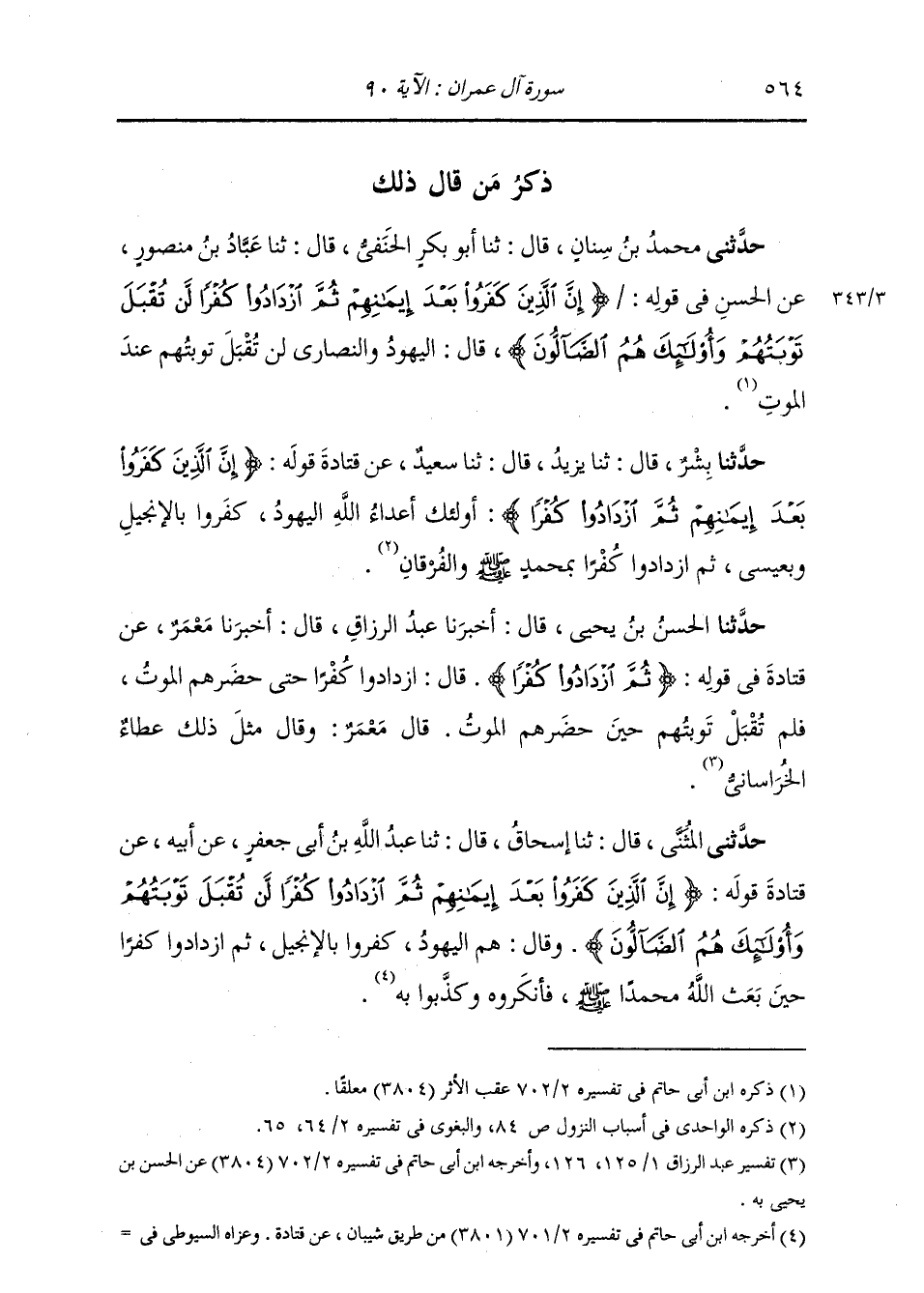 ذِكْرُ مَنْ قَالَ ذَلِكَ: حَدَّثَنِي مُحَمَّدُ بْنُ سِنَانٍ، قَالَ: ثنا أَبُو بَكْرٍ الْحَنَفِيُّ، قَالَ: ثنا عَبَّادُ بْنُ مَنْصُورٍ، عَنِ الْحَسَنِ، فِي قَوْلِهِ: {§إِنَّ الَّذِينَ كَفَرُوا بَعْدَ إِيمَانِهِمْ ثُمَّ ازْدَادُوا كُفْرًا لَنْ تُقْبَلَ تَوْبَتُهُمْ وَأُولَئِكَ هُمُ الضَّالُّونَ} [آل عمران: 90] قَالَ: «الْيَهُودُ وَالنَّصَارَى لَنْ تُقْبَلَ تَوْبَتُهُمْ عِنْدَ الْمَوْتِ»