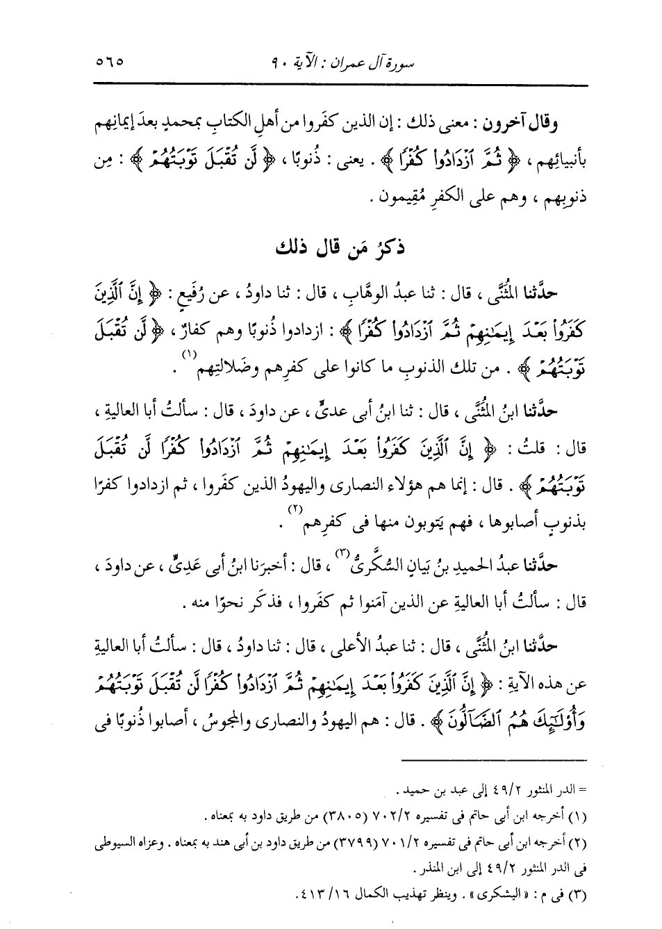 حَدَّثَنَا ابْنُ الْمُثَنَّى، قَالَ: ثنا ابْنُ أَبِي عَدِيٍّ، عَنْ دَاوُدَ، قَالَ: سَأَلْتُ أَبَا الْعَالِيَةِ، قَالَ: قُلْتُ: {§إِنَّ الَّذِينَ كَفَرُوا بَعْدَ إِيمَانِهِمْ ثُمَّ ازْدَادُوا كُفْرًا لَنْ تُقْبَلَ تَوْبَتُهُمْ} [آل عمران: 90] قَالَ: «إِنَّمَا هُمْ هَؤُلَاءِ النَّصَارَى وَالْيَهُودُ الَّذِينَ كَفَرُوا ثُمَّ ازْدَادُوا كُفْرًا بِذُنُوبٍ أَصَابُوهَا، فَهُمْ يَتُوبُونَ مِنْهَا فِي كُفْرِهِمْ» حَدَّثَنَا عَبْدُ الْحَمِيدِ بْنُ بَيَانٍ السُّكَّرِيُّ، قَالَ: أَخْبَرَنَا ابْنُ أَبِي عَدِيٍّ، عَنْ دَاوُدَ، قَالَ: سَأَلْتُ أَبَا الْعَالِيَةِ عَنِ الَّذِينَ آمَنُوا ثُمَّ كَفَرُوا، فَذَكَرَ نَحْوًا مِنْهُ