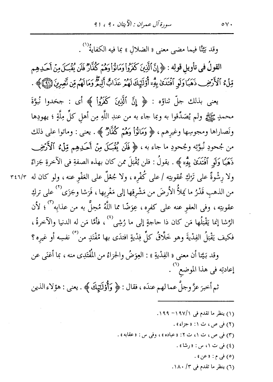 §الْقَوْلُ فِي تَأْوِيلِ قَوْلِهِ تَعَالَى: {إِنَّ الَّذِينَ كَفَرُوا وَمَاتُوا وَهُمْ كُفَّارٌ فَلَنْ يُقْبَلَ مِنْ أَحَدِهِمْ مِلْءُ الْأَرْضِ ذَهَبًا وَلَوِ افْتَدَى بِهِ أُولَئِكَ لَهُمْ عَذَابٌ أَلِيمٌ وَمَا لَهُمْ مِنْ نَاصِرِينَ} [آل عمران: 91] يَعْنِي بِذَلِكَ جَلَّ ثناؤُهُ: {إِنَّ الَّذِينَ كَفَرُوا} [البقرة: 6] أَيْ جَحَدُوا نُبُوَّةَ مُحَمَّدٍ صَلَّى اللهُ عَلَيْهِ وَسَلَّمَ، وَلَمْ يُصَدِّقُوا بِهِ، وَبِمَا جَاءَ بِهِ مِنْ عِنْدِ اللَّهِ مِنْ أَهْلِ كُلِّ مِلَّةٍ يَهُودُهَا وَنَصَارَاهَا وَمَجُوسُهَا وَغَيْرُهُمْ {وَمَاتُوا وَهُمْ كُفَّارٌ} [البقرة: 161] يَعْنِي: وَمَاتُوا عَلَى ذَلِكَ مِنْ جُحُودِ نُبُوَّتِهِ، وَجُحُودِ مَا جَاءَ بِهِ {فَلَنْ يُقْبَلَ مِنْ أَحَدِهِمْ مِلْءُ الْأَرْضِ ذَهَبًا وَلَوِ افْتَدَى بِهِ} [آل عمران: 91] يَقُولُ: فَلَنْ يُقْبَلَ مِمَّنْ كَانَ بِهَذِهِ الصُّفَّةِ فِي الْآخِرَةِ جَزَاءٌ وَلَا رِشْوَةٌ عَلَى تَرْكِ عُقُوبَتِهِ عَلَى كُفْرِهِ، وَلَا جُعْلٌ عَلَى الْعَفْوِ عَنْهُ، وَلَوْ كَانَ لَهُ مِنَ الذَّهَبِ قَدْرُ مَا يَمْلَأُ الْأَرْضَ مِنْ مَشْرِقِهَا إِلَى مَغْرِبِهَا، فَرْشًا وَجِزًى عَلَى تَرْكِ عُقُوبَتِهِ وَفِي الْعَفْوِ عَنْهُ عَلَى كُفْرِهِ عِوَضًا مِمَّا اللَّهُ مُحِلٌّ بِهِ مِنْ عَذَابِهِ؛ لِأَنَّ الرِّشَا إِنَّمَا يَقْبَلُهَا مَنْ كَانَ ذَا حَاجَةٍ إِلَى مَا رُشِيَ، فَأَمَّا مَنْ لَهُ الدُّنْيَا وَالْآخِرَةُ، فَكَيْفَ يَقْبَلُ الْفِدْيَةَ، وَهُوَ خَلَاقُ كُلِّ فِدْيَةٍ افْتَدَى بِهَا مُفْتَدٍ عَنْ نَفْسِهِ أَوْ غَيْرِهِ؟ وَقَدْ بَيَّنَّا أَنَّ مَعْنَى الْفِدْيَةِ الْعِوَضُ وَالْجَزَاءُ مِنَ الْمُفْتَدَى مِنْهُ بِمَا أَغْنَى عَنْ إِعَادَتِهِ فِي هَذَا الْمَوْضِعِ، ثُمَّ أَخْبَرَ عَزَّ وَجَلَّ عَمَّا لَهُمْ عِنْدَهُ، فَقَالَ: {أُولَئِكَ} [البقرة: 5] يَعْنِي: هَؤُلَاءِ الَّذِينَ