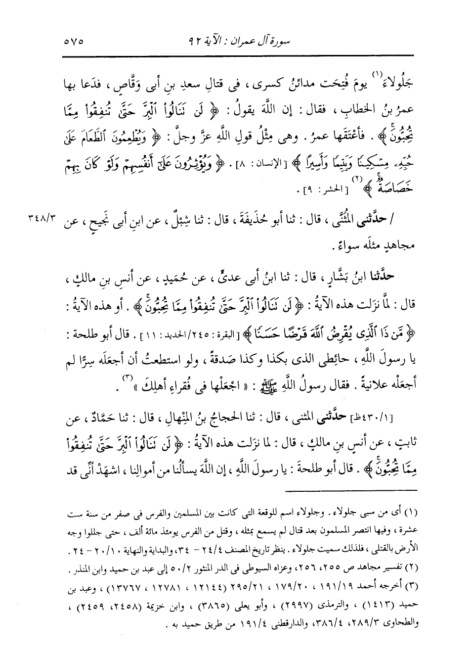 حَدَّثَنِي الْمُثَنَّى، قَالَ: ثنا الْحَجَّاجُ بْنُ الْمِنْهَالِ، قَالَ: ثنا حَمَّادٌ، عَنْ ثَابِتٍ، عَنْ أَنَسِ بْنِ مَالِكٍ، قَالَ: لَمَّا نَزَلَتْ هَذِهِ الْآيَةُ: {§لَنْ تَنَالُوا الْبِرَّ حَتَّى تُنْفِقُوا مِمَّا تُحِبُّونَ} [آل عمران: 92] قَالَ أَبُو طَلْحَةَ: يَا رَسُولَ اللَّهِ، إِنَّ اللَّهَ يَسْأَلُنَا مِنْ أَمْوَالِنَا، اشْهَدْ أَنِّي قَدْ -[576]- جَعَلْتُ أَرْضِي بِأَرِيحَا لِلَّهِ، فَقَالَ رَسُولُ اللَّهِ صَلَّى اللهُ عَلَيْهِ وَسَلَّمَ: «اجْعَلْهَا فِي قَرَابَتِكَ» فَجَعَلَهَا بَيْنَ حَسَّانَ بْنِ ثَابِتٍ وَأُبَيِّ بْنِ كَعْبٍ