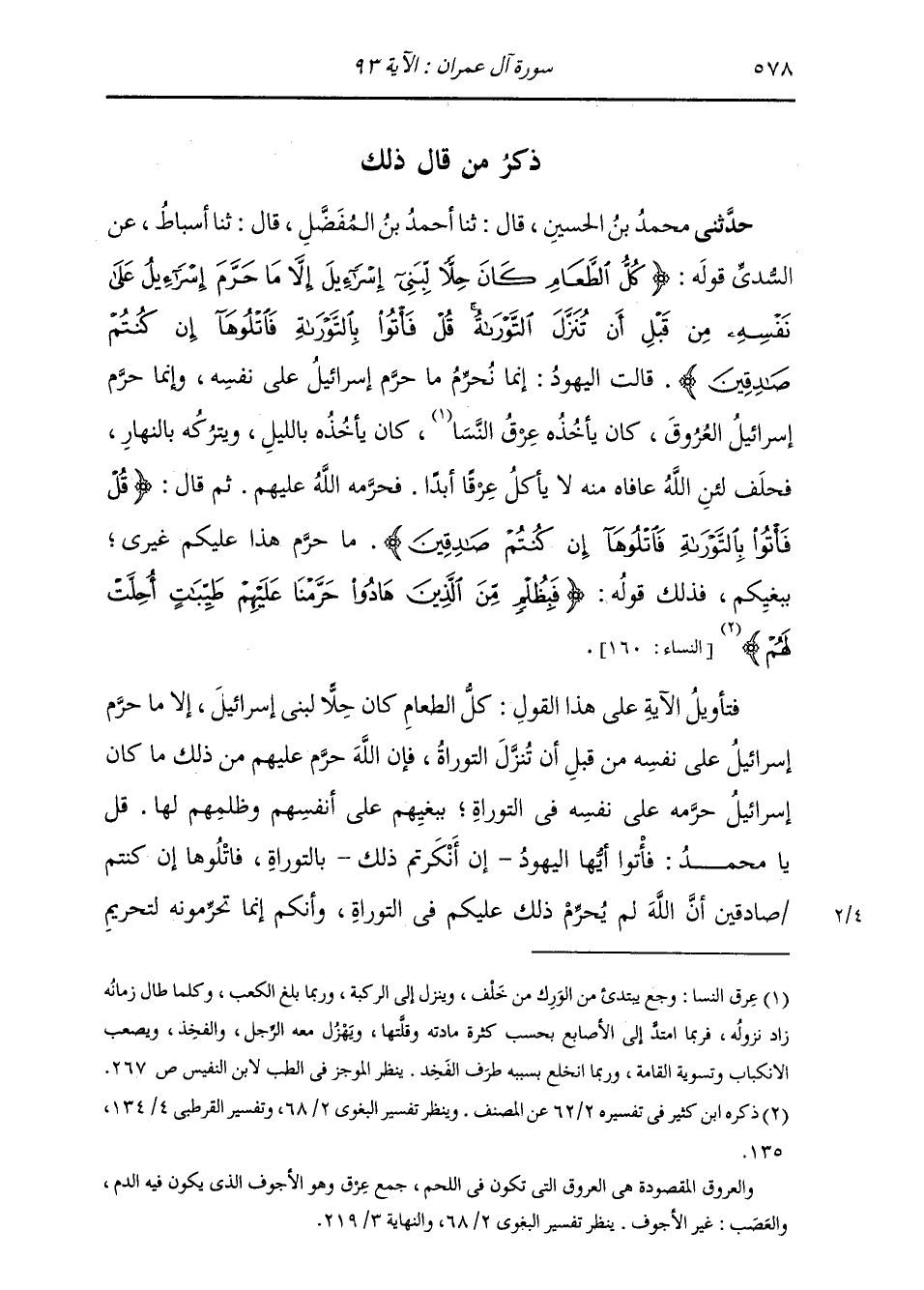 ذِكْرُ مَنْ قَالَ ذَلِكَ: حَدَّثَنِي مُحَمَّدُ بْنُ الْحُسَيْنِ، قَالَ: ثنا أَحْمَدُ بْنُ الْمُفَضَّلِ، قَالَ: ثنا أَسْبَاطٌ، عَنِ السُّدِّيِّ، قَوْلُهُ: {§كُلُّ الطَّعَامِ كَانَ حِلًّا لِبَنِي إِسْرَائِيلَ إِلَّا مَا حَرَّمَ إِسْرَائِيلُ عَلَى نَفْسِهِ مِنْ قَبْلِ أَنْ تُنَزَّلَ التَّوْرَاةُ قُلْ فَأْتُوا بِالتَّوْرَاةِ فَاتْلُوهَا إِنْ كُنْتُمْ صَادِقِينَ} [آل عمران: 93] " قَالَتِ الْيَهُودُ: إِنَّمَا نُحَرِّمُ مَا حَرَّمَ إِسْرَائِيلُ عَلَى نَفْسِهِ، وَإِنَّمَا حَرَّمَ إِسْرَائِيلُ الْعُرُوقَ، كَانَ يَأْخُذُهُ عِرْقُ النَّسَا، كَانَ يَأْخُذُهُ بِاللَّيْلِ وَيَتْرُكُهُ بِالنَّهَارِ، فَحَلَفَ لَئِنِ اللَّهُ عَافَاهُ مِنْهُ لَا يَأْكُلُ عِرْقًا أَبَدًا، فَحَرَّمَهُ اللَّهُ عَلَيْهِمْ ثُمَّ قَالَ: {قُلْ فَأْتُوا بِالتَّوْرَاةِ فَاتْلُوهَا إِنْ كُنْتُمْ صَادِقِينَ} [آل عمران: 93] مَا حَرَّمَ هَذَا عَلَيْكُمْ غَيْرِي بِبَغْيِكُمْ، فَذَلِكَ قَوْلُهُ: {فَبِظُلْمٍ مِنَ الَّذِينَ هَادُوا حَرَّمْنَا عَلَيْهِمْ طَيِّبَاتٍ أُحِلَّتْ لَهُمْ} [النساء: 160] فَتَأْوِيلُ الْآيَةِ عَلَى هَذَا الْقَوْلِ: كُلُّ الطَّعَامِ كَانَ حِلًّا لِبَنِي إِسْرَائِيلَ إِلَّا مَا حَرَّمَ إِسْرَائِيلُ عَلَى نَفْسِهِ مِنْ قَبْلِ أَنْ تُنَزَّلَ التَّوْرَاةُ، فَإِنَّ اللَّهَ حَرَّمَ عَلَيْهِمْ مِنْ ذَلِكَ مَا كَانَ إِسْرَائِيلُ حَرَّمَهُ عَلَى نَفْسِهِ فِي التَّوْرَاةِ، بِبَغْيِهِمْ عَلَى أَنْفُسِهِمْ، وَظُلْمِهِمْ لَهَا، قُلْ يَا مُحَمَّدُ: فَأْتُوا أَيُّهَا الْيَهُودُ إِنْ أَنْكَرْتُمْ ذَلِكَ بِالتَّوْرَاةِ، فَاتْلُوهَا إِنْ كُنْتُمْ صَادِقِينَ أَنَّ اللَّهَ لَمْ يُحَرِّمْ ذَلِكَ عَلَيْكُمْ فِي التَّوْرَاةِ، وَأَنَّكُمْ إِنَّمَا تُحَرِّمُونَهُ لِتَحْرِيمِ