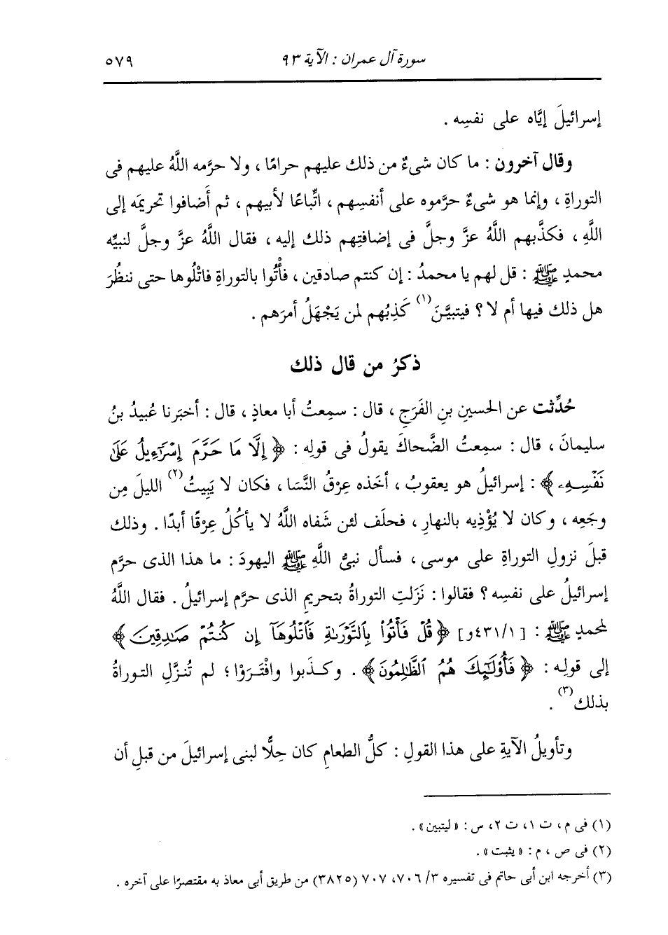 إِسْرَائِيلَ إِيَّاهُ عَلَى نَفْسِهِ " وَقَالَ آخَرُونَ: مَا كَانَ شَيْءٌ مِنْ ذَلِكَ عَلَيْهِمْ حَرَامًا، لَا حَرَّمَهُ اللَّهُ عَلَيْهِمْ فِي التَّوْرَاةِ، وَإِنَّمَا هُوَ شَيْءٌ حَرَّمُوهُ عَلَى أَنْفُسِهِمُ اتِّبَاعًا لِأَبِيهِمْ، ثُمَّ أَضَافُوا تَحْرِيمَهُ إِلَى اللَّهِ، فَكَذَّبَهُمُ اللَّهُ عَزَّ وَجَلَّ فِي إِضَافَتِهِمْ ذَلِكَ إِلَيْهِ، فَقَالَ اللَّهُ عَزَّ وَجَلَّ لِنَبِيِّهِ مُحَمَّدٍ صَلَّى اللهُ عَلَيْهِ وَسَلَّمَ: قُلْ لَهُمْ يَا مُحَمَّدُ: إِنْ كُنْتُمْ صَادِقِينَ، فَأْتُوا بِالتَّوْرَاةِ فَاتْلُوهَا، حَتَّى نَنْظُرَ هَلْ ذَلِكَ فِيهَا، أَمْ لَا؟ لِيَتَبَيَّنَ كَذِبُهُمْ لِمَنْ يَجْهَلُ أَمَرَهُمْ