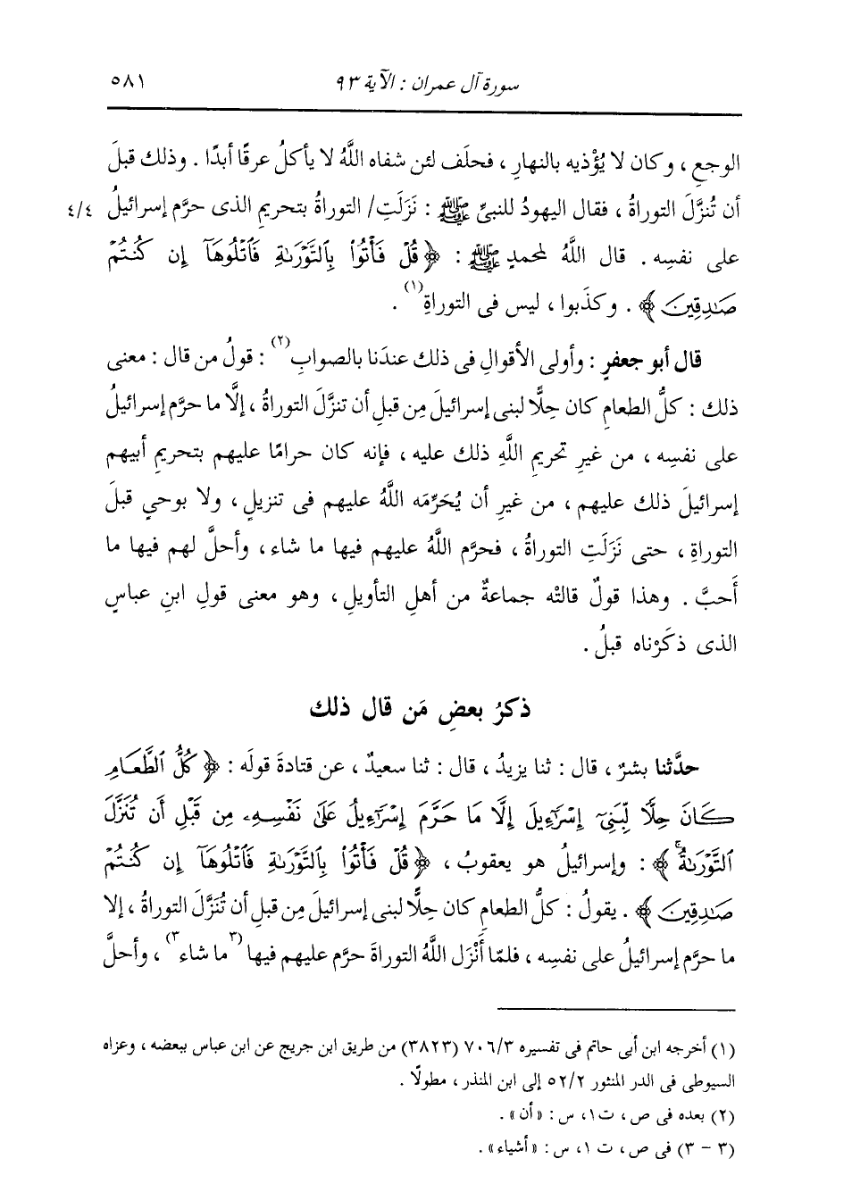 ذِكْرُ مَنْ قَالَ ذَلِكَ: حَدَّثَنَا بِشْرٌ، قَالَ: ثنا يَزِيدُ، قَالَ: ثنا سَعِيدٌ، عَنْ قَتَادَةَ، قَوْلُهُ: {§كُلُّ الطَّعَامِ كَانَ حِلًّا لِبَنِي إِسْرَائِيلَ إِلَّا مَا حَرَّمَ إِسْرَائِيلُ عَلَى نَفْسِهِ مِنْ قَبْلِ أَنْ تُنَزَّلَ التَّوْرَاةُ} [آل عمران: 93] " وَإِسْرَائِيلُ: هُوَ يَعْقُوبُ " {قُلْ فَأْتُوا بِالتَّوْرَاةِ فَاتْلُوهَا إِنْ كُنْتُمْ صَادِقِينَ} [آل عمران: 93] يَقُولُ: «كُلُّ الطَّعَامِ كَانَ حِلًّا لِبَنِي إِسْرَائِيلَ مِنْ قَبْلِ أَنْ تُنَزَّلَ التَّوْرَاةُ. إِلَّا مَا حَرَّمَ إِسْرَائِيلُ عَلَى نَفْسِهِ، فَلَمَّا أَنْزَلَ اللَّهُ التَّوْرَاةَ حَرَّمَ عَلَيْهِمْ فِيهَا مَا شَاءَ، وَأَحَلَّ -[582]- لَهُمْ مَا شَاءَ» حُدِّثْتُ عَنْ عَمَّارٍ، قَالَ: ثنا ابْنُ أَبِي جَعْفَرٍ، عَنْ أَبِيهِ، عَنْ قَتَادَةَ بِنَحْوِهِ. وَاخْتَلَفَ أَهْلُ التَّأْوِيلِ فِي الَّذِي كَانَ إِسْرَائِيلُ حَرَّمَهُ عَلَى نَفْسِهِ، فَقَالَ بَعْضُهُمْ: كَانَ الَّذِي حَرَّمَهُ إِسْرَائِيلُ عَلَى نَفْسِهِ الْعُرُوقَ
