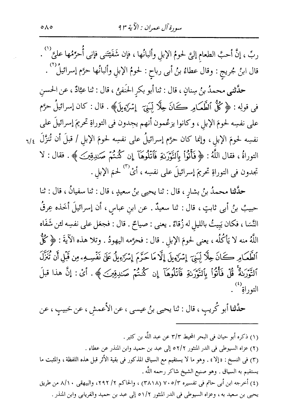 حَدَّثَنَا مُحَمَّدُ بْنُ بَشَّارٍ، قَالَ: ثنا يَحْيَى بْنُ سَعِيدٍ، قَالَ: ثنا سُفْيَانُ، قَالَ: ثنا حَبِيبُ بْنُ أَبِي ثَابِتٍ، قَالَ: ثنا سَعِيدٌ، عَنِ ابْنِ عَبَّاسٍ: " أَنَّ §إِسْرَائِيلَ، أَخَذَهُ عِرْقُ النَّسَا، فَكَانَ يَبِيتُ بِاللَّيْلِ لَهُ زُقَاءٌ يَعْنِي صِيَاحًا قَالَ: فَجَعَلَ عَلَى نَفْسِهِ لَئِنْ شَفَاهُ اللَّهُ مِنْهُ لَا يَأْكُلُهُ يَعْنِي لُحُومَ الْإِبِلِ قَالَ: فَحَرَّمَهُ الْيَهُودُ، وَتَلَا هَذِهِ الْآيَةَ: {كُلُّ الطَّعَامِ كَانَ حِلًّا لِبَنِي إِسْرَائِيلَ إِلَّا مَا حَرَّمَ إِسْرَائِيلُ عَلَى نَفْسِهِ مِنْ قَبْلِ أَنْ تُنَزَّلَ التَّوْرَاةُ قُلْ فَأْتُوا بِالتَّوْرَاةِ فَاتْلُوهَا إِنْ كُنْتُمْ صَادِقِينَ} [آل عمران: 93] أَيْ أَنَّ هَذَا قَبْلَ التَّوْرَاةِ "