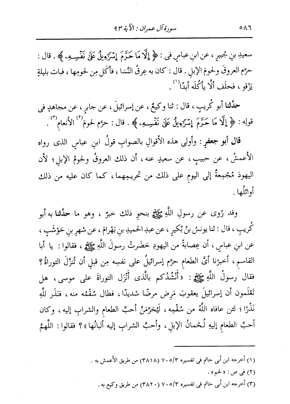 حَدَّثَنَا أَبُو كُرَيْبٍ، قَالَ: ثنا وَكِيعٌ، عَنْ إِسْرَائِيلَ، عَنْ جَابِرٍ، عَنْ مُجَاهِدٍ، فِي قَوْلِهِ: {§إِلَّا مَا حَرَّمَ إِسْرَائِيلُ عَلَى نَفْسِهِ} [آل عمران: 93] قَالَ: «حَرَّمَ لُحُومَ الْأَنْعَامِ» قَالَ أَبُو جَعْفَرٍ: وَأَوْلَى هَذِهِ الْأَقْوَالِ بِالصَّوَابِ قَوْلُ ابْنِ عَبَّاسٍ الَّذِي رَوَاهُ الْأَعْمَشُ، عَنْ حَبِيبٍ، عَنْ سَعِيدٍ، عَنْهُ أَنَّ ذَلِكَ الْعُرُوقُ وَلُحُومُ الْإِبِلِ؛ لِأَنَّ الْيَهُودَ مُجْمِعَةٌ إِلَى الْيَوْمِ عَلَى ذَلِكَ مِنْ تَحْرِيمِهَا، كَمَا كَانَ عَلَيْهِ مِنْ ذَلِكَ أَوَائِلُهَا وَقَدْ رُوِيَ عَنْ رَسُولِ اللَّهِ صَلَّى اللهُ عَلَيْهِ وَسَلَّمَ بِنَحْوِ ذَلِكَ خَبَرٌ