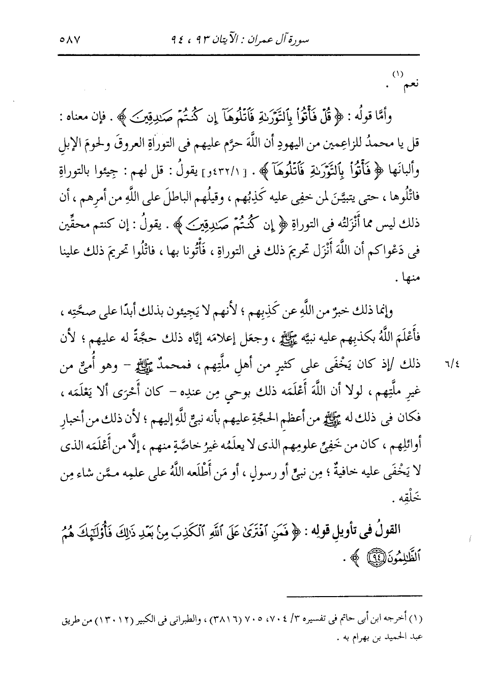§الْقَوْلُ فِي تَأْوِيلِ قَوْلِهِ تَعَالَى: {فَمَنِ افْتَرَى عَلَى اللَّهِ الْكَذِبَ مِنْ بَعْدِ ذَلِكَ فَأُولَئِكَ هُمُ الظَّالِمُونَ} [آل عمران: 94]-[588]- يَعْنِي جَلَّ ثناؤُهُ بِذَلِكَ: فَمَنْ كَذَبَ عَلَى اللَّهِ مِنَّا وَمِنْكُمْ مِنْ بَعْدِ مَجِيئِكُمْ بِالتَّوْرَاةِ، وَتِلَاوَتِكُمْ إِيَّاهَا، وَعُدْمِكُمْ مَا ادَّعَيْتُمْ مِنْ تَحْرِيمِ اللَّهِ الْعُرُوقَ وَلُحُومَ الْإِبِلِ وَأَلْبَانَهَا فِيهَا، {فَأُولَئِكَ هُمُ الظَّالِمُونَ} [البقرة: 229] يَعْنِي: فَمَنْ فَعَلَ ذَلِكَ مِنْهُمْ {فَأُولَئِكَ} [البقرة: 81] يَعْنِي فَهَؤُلَاءِ الَّذِينَ يَفْعَلُونَ ذَلِكَ {هُمُ الظَّالِمُونَ} [البقرة: 229] يَعْنِي فَهُمُ الْكَافِرُونَ الْقَائِلُونَ عَلَى اللَّهِ الْبَاطِلَ