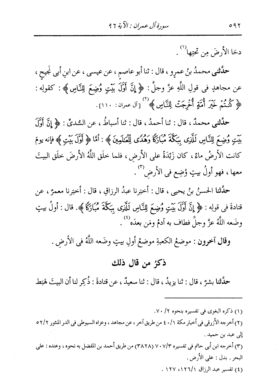 حَدَّثَنَا الْحَسَنُ بْنُ يَحْيَى، قَالَ: أَخْبَرَنَا عَبْدُ الرَّزَّاقِ، قَالَ: أَخْبَرَنَا مَعْمَرٌ، عَنْ قَتَادَةَ، فِي قَوْلِهِ: {§إِنَّ أَوَّلَ بَيْتٍ وُضِعَ لِلنَّاسِ لَلَّذِي بِبَكَّةَ مُبَارَكًا} [آل عمران: 96] قَالَ: «أَوَّلُ بَيْتٍ وَضَعَهُ اللَّهُ عَزَّ وَجَلَّ، فَطَافَ بِهِ آدَمُ وَمَنْ بَعْدَهُ» وَقَالَ آخَرُونَ مَوْضِعُ الْكَعْبَةِ مَوْضِعُ أَوَّلِ بَيْتٍ وَضَعَهُ اللَّهُ فِي الْأَرْضِ