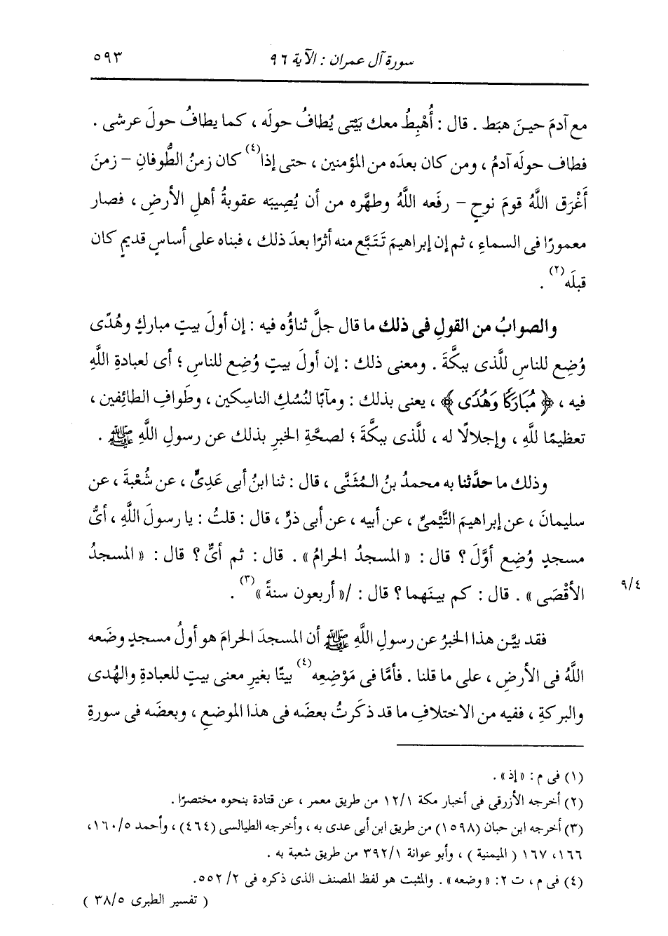 وَذَلِكَ مَا: حَدَّثَنَا بِهِ مُحَمَّدُ بْنُ الْمُثَنَّى، قَالَ: ثنا ابْنُ أَبِي عَدِيٍّ، عَنْ شُعْبَةَ، عَنْ سُلَيْمَانَ، عَنْ إِبْرَاهِيمَ التَّيْمِيِّ، عَنْ أَبِيهِ، عَنْ أَبِي ذَرٍّ، قَالَ: قُلْتُ يَا رَسُولَ اللَّهِ، §أَيُّ مَسْجِدٍ وُضِعَ أَوَّلُ؟ قَالَ: «الْمَسْجِدُ الْحَرَامُ» قَالَ: ثُمَّ أَيُّ؟ قَالَ: «الْمَسْجِدُ الْأَقْصَى» قَالَ: كَمْ بَيْنَهُمَا؟ قَالَ: أَرْبَعُونَ سَنَةً " فَقَدْ بَيَّنَ هَذَا الْخَبَرُ عَنْ رَسُولِ اللَّهِ صَلَّى اللهُ عَلَيْهِ وَسَلَّمَ أَنَّ الْمَسْجِدَ الْحَرَامَ هُوَ أَوَّلُ مَسْجِدٍ وَضَعَهُ اللَّهُ فِي الْأَرْضِ عَلَى مَا قُلْنَا، فَأَمَّا فِي وَضْعِهِ بَيْتًا بِغَيْرِ مَعْنَى بَيْتٍ لِلْعِبَادَةِ وَالْهُدَى وَالْبَرَكَةِ، فَفِيهِ مِنَ الِاخْتِلَافِ مَا قَدْ ذَكَرْتُ بَعْضَهُ فِي هَذَا الْمَوْضِعِ وَبَعْضَهُ فِي سُورَةِ -[594]- الْبَقَرَةِ وَغَيْرِهَا مِنْ سُوَرِ الْقُرْآنِ وَبَيَّنْتُ الصَّوَابَ مِنَ الْقَوْلِ عِنْدَنَا فِي ذَلِكَ بِمَا أَغْنَى ذَلِكَ عَنْ إِعَادَتِهِ فِي هَذَا الْمَوْضِعِ وَأَمَّا قَوْلُهُ: {لَلَّذِي بِبَكَّةَ مُبَارَكًا} [آل عمران: 96] فَإِنَّهُ يَعْنِي لَلْبَيْتُ الَّذِي بِمُزْدَحِمِ النَّاسِ لِطَوَافِهِمْ فِي حَجِّهِمْ وَعُمَرِهِمْ. وَأَصْلُ الْبَكِّ الزَّحْمُ، يُقَالُ مِنْهُ: بَكَّ فُلَانٌ فُلَانًا: إِذَا زَحَمَهُ وَصَدَمَهُ فَهُوَ. بِبَكَّةَ مُبَارَكًا، وَهُمْ يَتَبَاكُّونَ فِيهِ: يَعْنِي بِهِ: يَتَزَاحَمُونَ وَيَتَصَادَمُونَ فِيهِ، فَكَانَ بَكَّةُ: «فَعْلَةٌ» مِنْ بَكَّ فُلَانٌ فُلَانًا: زَحَمَهُ، سَمَّيَتِ الْبُقْعَةُ بِفِعْلِ الْمُزْدَحِمِينَ بِهَا، فَإِذَا كَانَتْ بَكَّةُ مَا وَصَفْنَا، وَكَانَ مَوْضِعُ ازْدِحَامِ النَّاسِ حَوْلَ الْبَيْتِ، وَكَانَ لَا طَوَافَ يَجُوزُ خَارِجَ الْمَسْجِدِ، كَانَ مَعْلُومًا بِذَلِكَ أَنْ يَكُونَ مَا حَوْلَ الْكَعْبَةِ مِنْ دَاخِلِ الْمَسْجِدِ، وَأَنَّ مَا كَانَ خَارِجَ الْمَسْجِدِ فَمَكَّةُ لَا بَكَّةُ؛ لِأَنَّهُ لَا مَعْنَى خَارِجَهُ يُوجِبُ عَلَى النَّاسِ التَّبَاكَّ فِيهِ، وَإِذَا كَانَ ذَلِكَ كَذَلِكَ كَانَ بَيِّنًّا بِذَلِكَ فَسَادُ قَوْلِ مَنْ قَالَ بَكَّةُ اسْمٌ لِبَطْنِ مَكَّةَ، وَمَكَّةُ اسْمٌ لِلْحَرَمِ