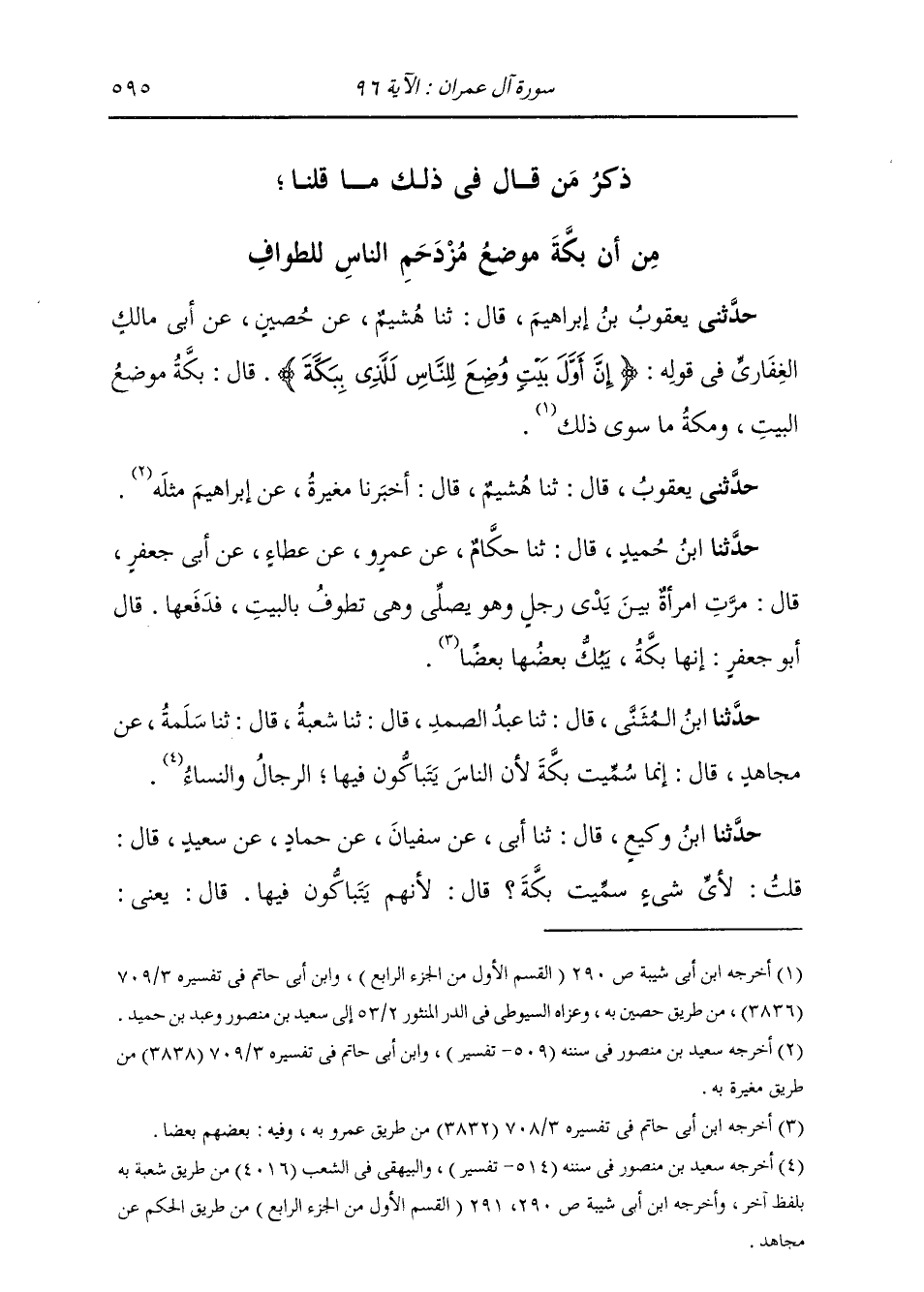 ذِكْرُ مَنْ قَالَ فِي ذَلِكَ مَا قُلْنَا مِنْ أَنَّ بَكَّةَ مَوْضِعُ مُزْدَحَمِ النَّاسِ لِلطَّوَافِ: حَدَّثَنِي يَعْقُوبُ بْنُ إِبْرَاهِيمَ، قَالَ: ثنا هُشَيْمٌ، عَنْ حُصَيْنٍ، عَنْ أَبِي مَالِكٍ الْغِفَارِيِّ، فِي قَوْلِهِ: {§إِنَّ أَوَّلَ بَيْتٍ وُضِعَ لِلنَّاسِ لَلَّذِي بِبَكَّةَ مُبَارَكًا} [آل عمران: 96] قَالَ: " بَكَّةُ: مَوْضِعُ الْبَيْتِ، وَمَكَّةُ: مَا سِوَى ذَلِكَ " حَدَّثَنِي يَعْقُوبُ، قَالَ: ثنا هُشَيْمٌ، قَالَ: أَخْبَرَنَا مُغِيرَةُ، عَنْ إِبْرَاهِيمَ، مِثْلَهُ