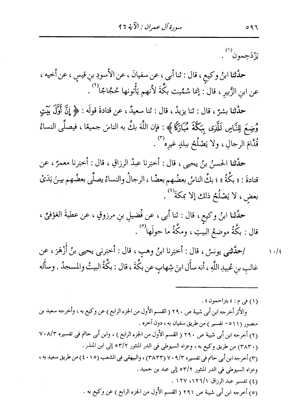 حَدَّثَنَا الْحَسَنُ بْنُ يَحْيَى، قَالَ: أَخْبَرَنَا عَبْدُ الرَّزَّاقِ، قَالَ: أَخْبَرَنَا مَعْمَرٌ، عَنْ قَتَادَةَ: «§بَكَّةُ» : بَكَّ النَّاسُ بَعْضُهُمْ بَعْضًا، الرِّجَالُ وَالنِّسَاءُ يُصَلِّي بَعْضُهُمْ بَيْنَ يَدَيْ بَعْضٍ، لَا يَصْلُحُ ذَلِكَ إِلَّا بِمَكَّةَ "