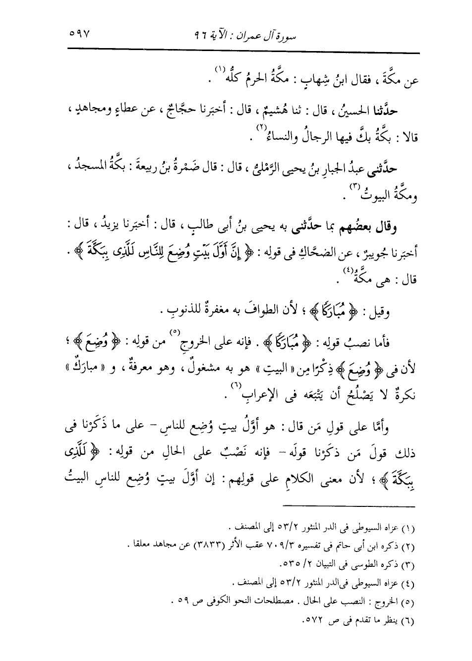 وَقَالَ بَعْضُهُمْ بِمَا: حَدَّثَنِي بِهِ يَحْيَى بْنُ أَبِي طَالِبٍ قَالَ: أَخْبَرَنَا يَزِيدُ، قَالَ: أَخْبَرَنَا جُوَيْبِرٌ، عَنِ الضَّحَّاكِ، فِي قَوْلِهِ: {§إِنَّ أَوَّلَ بَيْتٍ وُضِعَ لِلنَّاسِ لَلَّذِي بِبَكَّةَ} [آل عمران: 96] قَالَ: «هِيَ مَكَّةُ» وَقِيلَ: {مُبَارَكًا} [آل عمران: 96] لِأَنَّ الطَّوَافَ بِهِ مَغْفِرَةٌ لِلذُّنُوبِ، فَأَمَّا نَصْبُ قَوْلِهِ: {مُبَارَكًا} [آل عمران: 96] فَإِنَّهُ عَلَى الْخُرُوجِ مِنْ قَوْلِهِ: {وُضِعَ} [آل عمران: 96] ؛ لِأَنَّ فِي «وُضِعَ» ذِكْرًا مِنَ الْبَيْتِ هُوَ بِهِ مَشْغُولٌ وَهُوَ مَعْرِفَةٌ، وَ «مُبَارَكًا» نَكِرَةٌ لَا يَصْلُحُ أَنْ يَتْبَعَهُ فِي الْإِعْرَابِ، وَأَمَّا عَلَى قَوْلِ مَنْ قَالَ: هُوَ أَوَّلُ بَيْتٍ وُضِعَ لِلنَّاسِ عَلَى مَا ذَكَرْنَا فِي ذَلِكَ قَوْلَ مَنْ ذَكَرْنَا قَوْلَهُ، فَإِنَّهُ نُصِبَ عَلَى الْحَالِ مِنْ قَوْلِهِ: {لَلَّذِي بِبَكَّةَ} [آل عمران: 96] ؛ لِأَنَّ مَعْنَى الْكَلَامِ عَلَى قَوْلِهِمْ: إِنَّ أَوَّلَ بَيْتٍ وُضِعَ لِلنَّاسِ، الْبَيْتُ