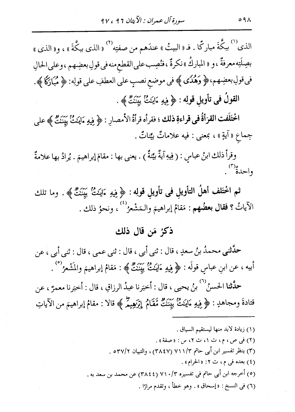 ذِكْرُ مَنْ قَالَ ذَلِكَ: حَدَّثَنِي مُحَمَّدُ بْنُ سَعْدٍ، قَالَ: ثني أَبِي، قَالَ: ثني عَمِّي، قَالَ: ثني أَبِي، عَنْ أَبِيهِ، عَنِ ابْنِ عَبَّاسٍ، قَوْلُهُ: {§فِيهِ آيَاتٌ بَيِّنَاتٌ} [آل عمران: 97] «مَقَامُ إِبْرَاهِيمَ، وَالْمَشْعَرُ»