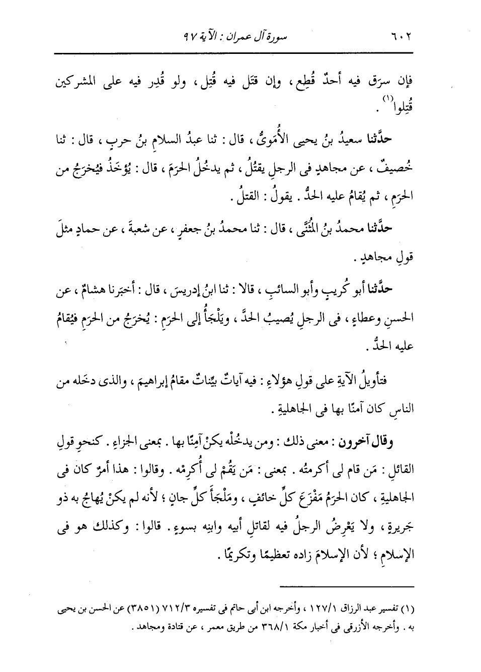 حَدَّثَنَا أَبُو كُرَيْبٍ، وَأَبُو السَّائِبِ، قَالَا: ثنا ابْنُ إِدْرِيسَ، قَالَ: أَخْبَرَنَا هِشَامٌ، عَنِ الْحَسَنِ، وَعَطَاءٍ، فِي §الرَّجُلِ يُصِيبُ الْحَدَّ، وَيَلْجَأُ إِلَى الْحَرَمِ: «يُخْرَجُ مِنَ الْحَرَمِ فَيُقَامُ عَلَيْهِ الْحَدُّ» فَتَأْوِيلُ الْآيَةِ عَلَى قَوْلِ هَؤُلَاءِ: فِيهِ آيَاتٌ بَيِّنَاتٌ مَقَامُ إِبْرَاهِيمَ، وَالَّذِي دَخَلَهُ مِنَ النَّاسِ كَانَ آمِنًا بِهَا فِي الْجَاهِلِيَّةِ. وَقَالَ آخَرُونَ: مَعْنَى ذَلِكَ: وَمَنْ يُدْخُلْهُ يَكُنْ آمِنًا بِهَا، بِمَعْنَى الْجَزَاءِ، كَنَحْوِ قَوْلِ الْقَائِلِ: مَنْ قَامَ لِي أَكْرَمْتُهُ: بِمَعْنَى مِنْ يَقُمْ لِي أُكْرِمْهُ، وَقَالُوا: هَذَا أَمْرٌ كَانَ فِي الْجَاهِلِيَّةِ، كَانَ الْحَرَمُ مَفْزَعَ كُلِّ خَائِفٍ، وَمَلْجَأَ كُلِّ جَانٍ؛ لِأَنَّهُ لَمْ يَكُنْ يُهَاجُ لَهُ ذُو جَرِيرَةٍ، وَلَا يَعْرِضُ الرَّجُلُ فِيهِ لِقَاتِلِ أَبِيهِ وَابْنِهِ بِسُوءٍ، قَالُوا: وَكَذَلِكَ هُوَ فِي الْإِسْلَامِ؛ لِأَنَّ الْإِسْلَامَ زَادَهُ تَعْظِيمًا وَتَكْرِيمًا
