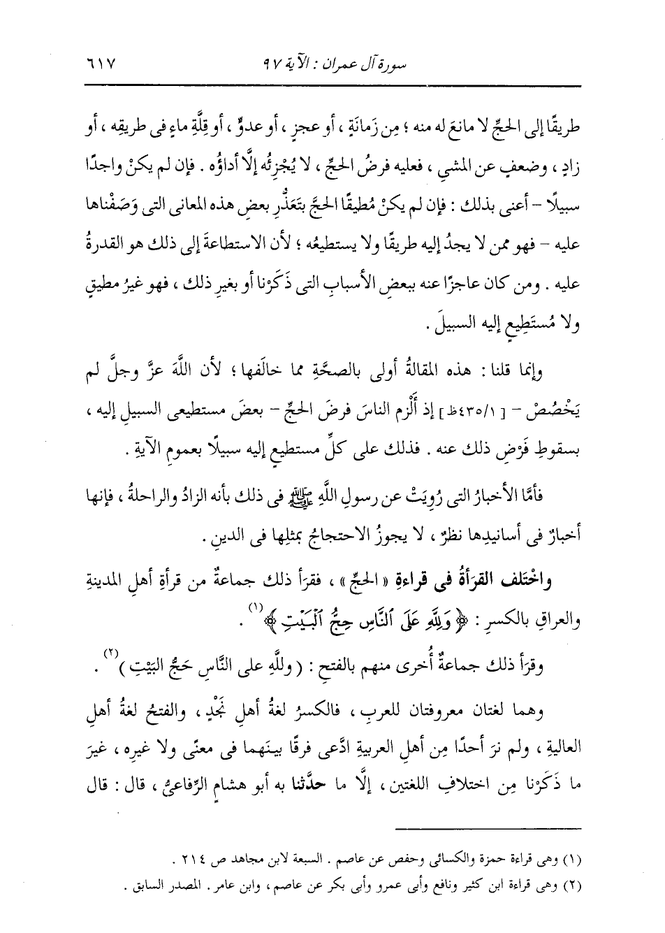 طَرِيقًا إِلَى الْحَجِّ لَا مَانِعَ لَهُ مِنْهُ مِنْ زَمَانِهِ، أَوْ عَجْزٍ، أَوْ عَدُوٍّ، أَوْ قِلَّةِ مَاءٍ فِي طَرِيقِهِ، أَوْ زَادٍ، وَضَعْفٍ عَنِ الْمَشْي، فَعَلَيْهِ فَرْضُ الْحَجِّ لَا يُجْزِيهِ إِلَّا أَدَاؤُهُ فَإِنْ لَمْ يَكُنْ وَاجِدًا سَبِيلًا، أَعْنِي بِذَلِكَ: فَإِنْ لَمْ يَكُنْ مُطِيقًا الْحَجَّ بِتَعَذُّرِ بَعْضِ هَذِهِ الْمَعَانِي الَّتِي وَصَفْنَاهَا عَلَيْهِ، فَهُوَ مِمَّنْ لَا يَجِدُ إِلَيْهِ طَرِيقًا، وَلَا يَسْتَطِيعُهُ؛ لِأَنَّ الِاسْتِطَاعَةَ إِلَى ذَلِكَ هُوَ الْقُدْرَةُ عَلَيْهِ، وَمَنْ كَانَ عَاجِزًا عَنْهُ بِبَعْضِ الْأَسْبَابِ الَّتِي ذَكَرْنَا أَوْ بِغَيْرِ ذَلِكَ، فَهُوَ غَيْرُ مُطِيقٍ وَلَا مُسْتَطِيعٍ إِلَيْهِ السَّبِيلَ. وَإِنَّمَا قُلْنَا: هَذِهِ الْمَقَالَةُ أَوْلَى بِالصِّحَّةِ مِمَّا خَالَفَهَا؛ لِأَنَّ اللَّهَ عَزَّ وَجَلَّ لَمْ يُخَصِّصْ إِذْ أَلْزَمَ النَّاسَ فَرْضَ الْحَجِّ بَعْضَ مُسْتَطِيعِي السَّبِيلِ إِلَيْهِ بِسُقُوطِ فَرْضِ ذَلِكَ عَنْهُ فَذَلِكَ عَلَى كُلِّ مُسْتَطِيعٍ إِلَيْهِ سَبِيلًا بِعُمُومِ الْآيَةِ، فَأَمَّا الْأَخْبَارُ الَّتِي رُوِيَتْ عَنْ رَسُولِ اللَّهِ صَلَّى اللهُ عَلَيْهِ وَسَلَّمَ فِي ذَلِكَ بِأَنَّهُ الزَّادُ وَالرَّاحِلَةُ، فَإِنَّهَا أَخْبَارٌ فِي أَسَانِيدِهَا نَظَرٌ، لَا يَجُوزُ الِاحْتِجَاجُ بِمِثْلِهَا فِي الدِّينِ. وَاخْتَلَفَ الْقُرَّاءُ فِي قِرَاءَةِ الْحَجِّ، فَقَرَأَ ذَلِكَ جَمَاعَةٌ مِنْ قُرَّاءِ أَهْلِ الْمَدِينَةِ وَالْعِرَاقِ بِالْكَسْرِ: {وَلِلَّهِ عَلَى النَّاسِ حِجُّ الْبَيْتِ} [آل عمران: 97] ، وَقَرَأَ ذَلِكَ جَمَاعَةٌ أُخَرُ مِنْهُمْ بِالْفَتْحِ: (وَلِلَّهِ عَلَى النَّاسِ حَجُّ الْبَيْتِ) وَهُمَا لُغَتَانِ مَعْرُوفَتَانِ لِلْعَرَبِ، فَالْكَسْرُ لُغَةُ أَهْلِ نَجْدٍ، وَالْفَتْحُ لُغَةُ أَهْلِ الْعَالِيَةِ، وَلَمْ نَرَ أَحَدًا مِنْ أَهْلِ الْعَرَبِيَّةِ ادَّعَى فَرْقًا بَيْنَهُمَا فِي مَعْنَى وَلَا غَيْرِهِ غَيْرَ مَا ذَكَرْنَا مِنَ اخْتِلَافِ اللُّغَتَيْنِ