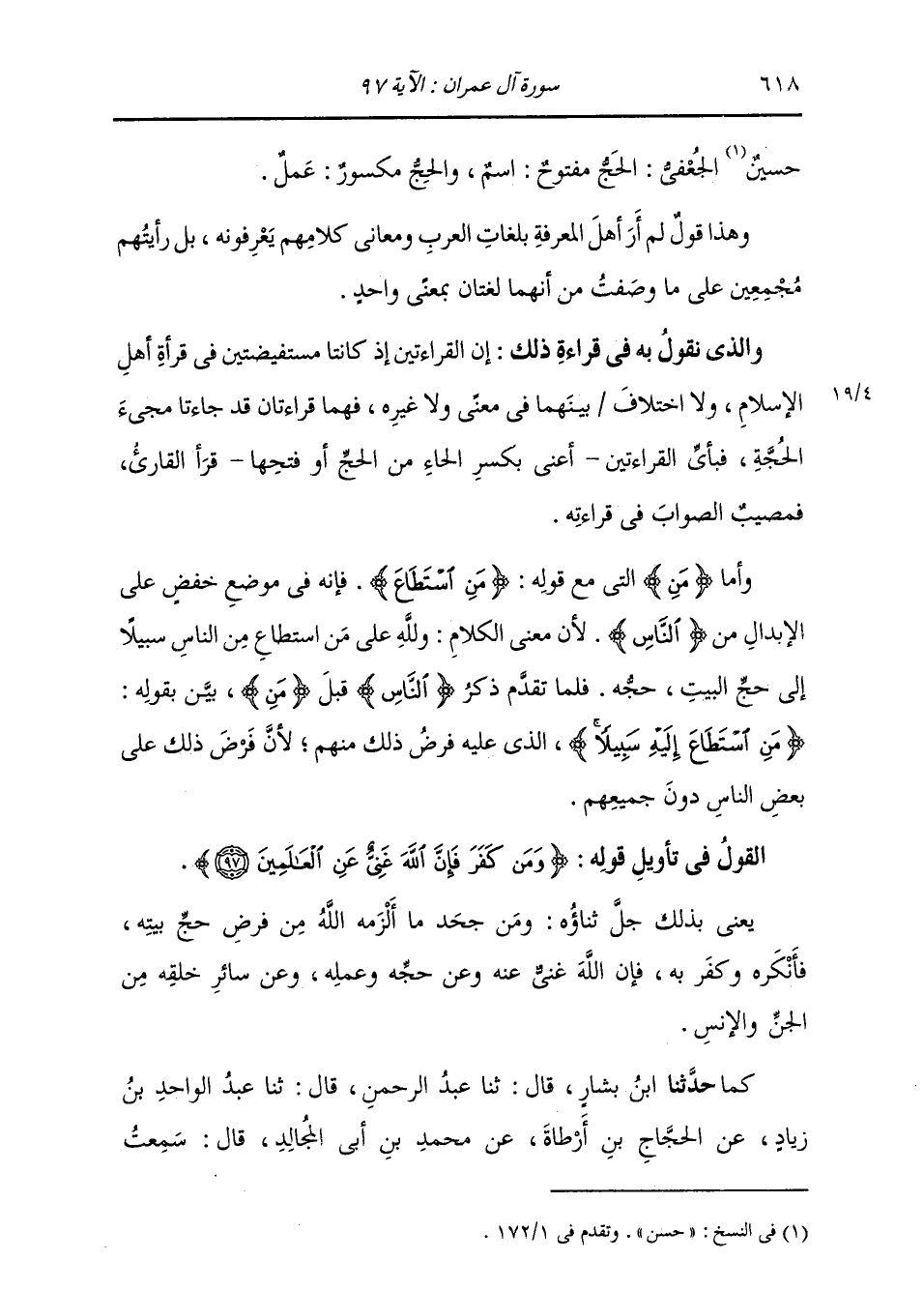 حُسَيْنٌ الْجُعْفِيُّ: " §الْحَجُّ مَفْتُوحٌ: اسْمٌ، وَالْحَجُّ مَكْسُورٌ: عَمَلٌ «وَهَذَا قَوْلٌ لَمْ أَرْ أَهْلَ الْمَعْرِفَةِ بِلُغَاتِ الْعَرَبِ وَمَعَانِي كَلَامِهِمْ يَعْرِفُونَهُ، بَلْ رَأَيْتُهُمْ مُجْمِعِينَ عَلَى مَا وَصَفْتُ مِنْ أَنَّهُمَا لُغَتَانِ بِمَعْنًى وَاحِدٍ. وَالَّذِي نَقُولُ بِهِ فِي قِرَاءَةِ ذَلِكَ أَنَّ الْقِرَاءَتَيْنِ إِذْ كَانَتَا مُسْتَفِيضَتَيْنِ فِي قِرَاءَةِ أَهْلِ الْإِسْلَامِ، وَلَا اخْتِلَافَ بَيْنَهُمَا فِي مَعْنًى وَلَا غَيْرِهِ، فَهُمَا قِرَاءَتَانِ قَدْ جَاءَتَا مَجِيءَ الْحُجَّةِ، فَبِأَيِّ الْقِرَاءَتَيْنِ - أَعِنِّي بِكَسْرِ الْحَاءِ مِنَ» الْحَجِّ «أَوْ فَتْحِهَا - قَرَأَ الْقَارِئُ فَمُصُيبٌ الصَّوَابَ فِي قِرَاءَتِهِ. وَأَمَّا» مَنْ " الَّتِي مَعَ قَوْلِهِ: {مَنِ اسْتَطَاعَ} [آل عمران: 97] فَإِنَّهُ فِي مَوْضِعِ خَفْضٍ عَلَى الْإِبْدَالِ مِنَ النَّاسِ؛ لِأَنَّ مَعْنَى الْكَلَامِ: وَلِلَّهِ عَلَى مَنِ اسْتَطَاعَ مِنَ النَّاسِ سَبِيلًا إِلَى حَجِّ الْبَيْتِ حَجُّهُ؛ فَلَمَّا تَقَدَّمَ ذِكْرُ النَّاسِ قَبْلَ «مَنْ» بَيَّنَ بِقَوْلِهِ: {مَنِ اسْتَطَاعَ إِلَيْهِ سَبِيلًا} [آل عمران: 97] ، الَّذِي عَلَيْهِ فَرْضُ ذَلِكَ مِنْهُمْ؛ لِأَنَّ فَرْضَ ذَلِكَ عَلَى بَعْضِ النَّاسِ دُونَ جَمِيعِهِمْ