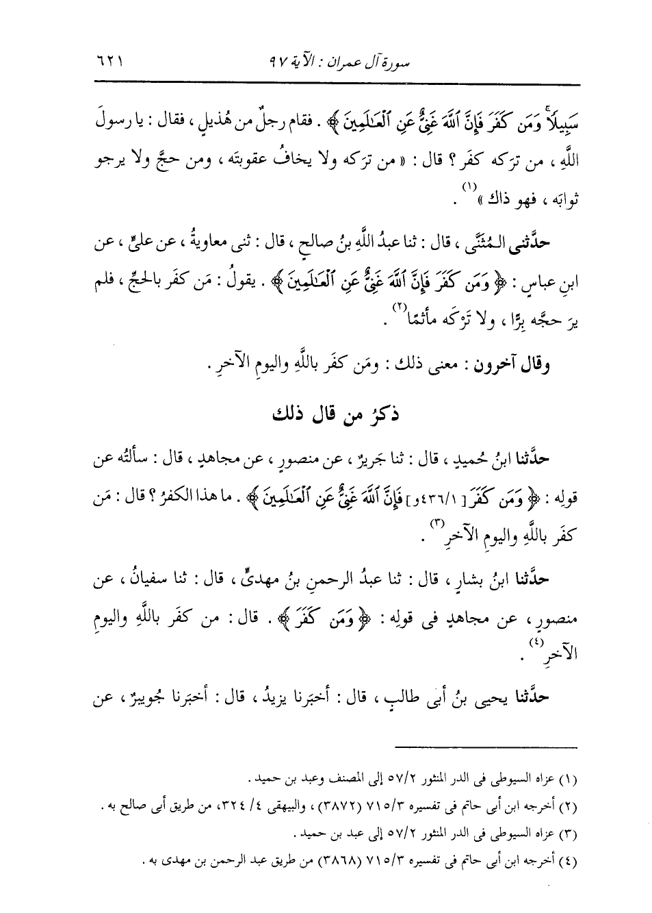 حَدَّثَنِي الْمُثَنَّى، قَالَ: ثنا عَبْدُ اللَّهِ بْنُ صَالِحٍ، قَالَ: ثني مُعَاوِيَةُ، عَنْ عَلِيٍّ، عَنِ ابْنِ عَبَّاسٍ: {§وَمَنْ كَفَرَ فَإِنَّ اللَّهَ غَنِيُّ عَنِ الْعَالَمِينَ} [آل عمران: 97] يَقُولُ: «مَنْ كَفَرَ بِالْحَجِّ، فَلَمْ يَرَ حَجَّهُ بِرًّا، وَلَا تَرْكَهُ مَأْثَمًا» وَقَالَ آخَرُونَ: مَعْنَى ذَلِكَ: وَمَنْ كَفَرَ بِاللَّهِ وَالْيَوْمِ الْآخِرِ