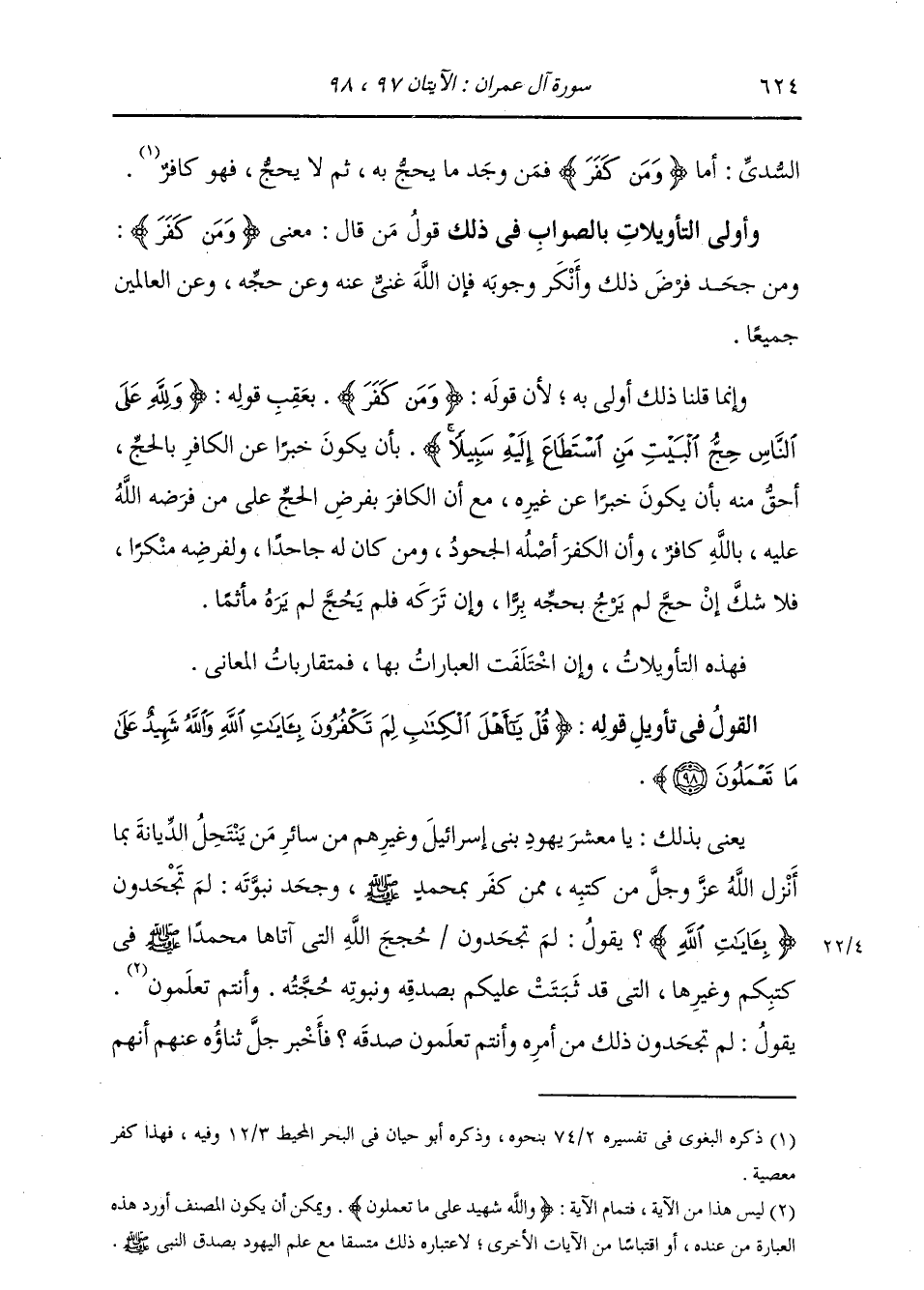 السُّدِّيِّ «أَمَّا §مَنْ كَفَرَ فَمَنْ وَجَدَ مَا يَحُجُّ بِهِ ثُمَّ لَا يَحُجُّ، فَهُوَ كَافِرٌ» وَأَوْلَى التَّأْوِيلَاتِ بِالصَّوَابِ فِي ذَلِكَ قَوْلُ مَنْ قَالَ: مَعْنَى {وَمَنْ كَفَرَ} [البقرة: 126] وَمَنْ جَحَدَ فَرْضَ ذَلِكَ وَأَنْكَرَ وُجُوبَهُ، فَإِنَّ اللَّهَ غَنِيُّ عَنْهُ وَعَنْ حَجِّهِ وَعَنِ الْعَالَمِينَ جَمِيعًا. وَإِنَّمَا قُلْنَا ذَلِكَ أَوْلَى بِهِ؛ لِأَنَّ قَوْلَهُ: {وَمَنْ كَفَرَ} [البقرة: 126] يَعْقُبُ قَوْلَهُ: {وَلِلَّهِ عَلَى النَّاسِ حَجُّ الْبَيْتِ مَنِ اسْتَطَاعَ إِلَيْهِ سَبِيلًا} [آل عمران: 97] بِأَنْ يَكُونَ خَبَرًا عَنِ الْكَافِرِ بِالْحَجِّ أَحَقُّ مِنْهُ بِأَنْ يَكُونَ خَبَرًا عَنْ غَيْرِهِ، مَعَ أَنَّ الْكَافِرَ بِفَرْضِ الْحَجِّ عَلَى مَنْ فَرَضَهُ اللَّهُ عَلَيْهِ بِاللَّهِ كَافِرٌ، وَإِنَّ الْكُفْرَ أَصْلُهُ الْجُحُودُ، وَمَنْ كَانَ لَهُ جَاحِدًا وَلِفَرْضِهِ مُنْكِرًا، فَلَا شَكَّ إِنْ حَجَّ لَمْ يَرْجُ بِحَجِّهِ بِرًّا، وَإِنْ تَرَكَهُ فَلَمْ يَحُجَّ لَمْ يَرَهُ مَأْثَمًا، فَهَذِهِ التَّأْوِيلَاتُ وَإِنِ اخْتَلَفَتِ الْعِبَارَاتُ بِهَا فَمُتَقَارِبَاتُ الْمَعَانِي